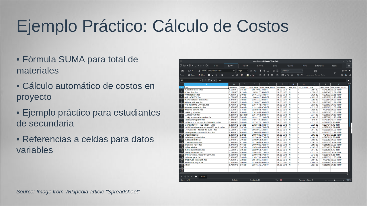 This slide presents a practical example of calculating costs in a project, targeted at high school students, using Excel's SUM formula to total material expenses. It demonstrates automatic cost computation through references to variable data cells for dynamic updates.