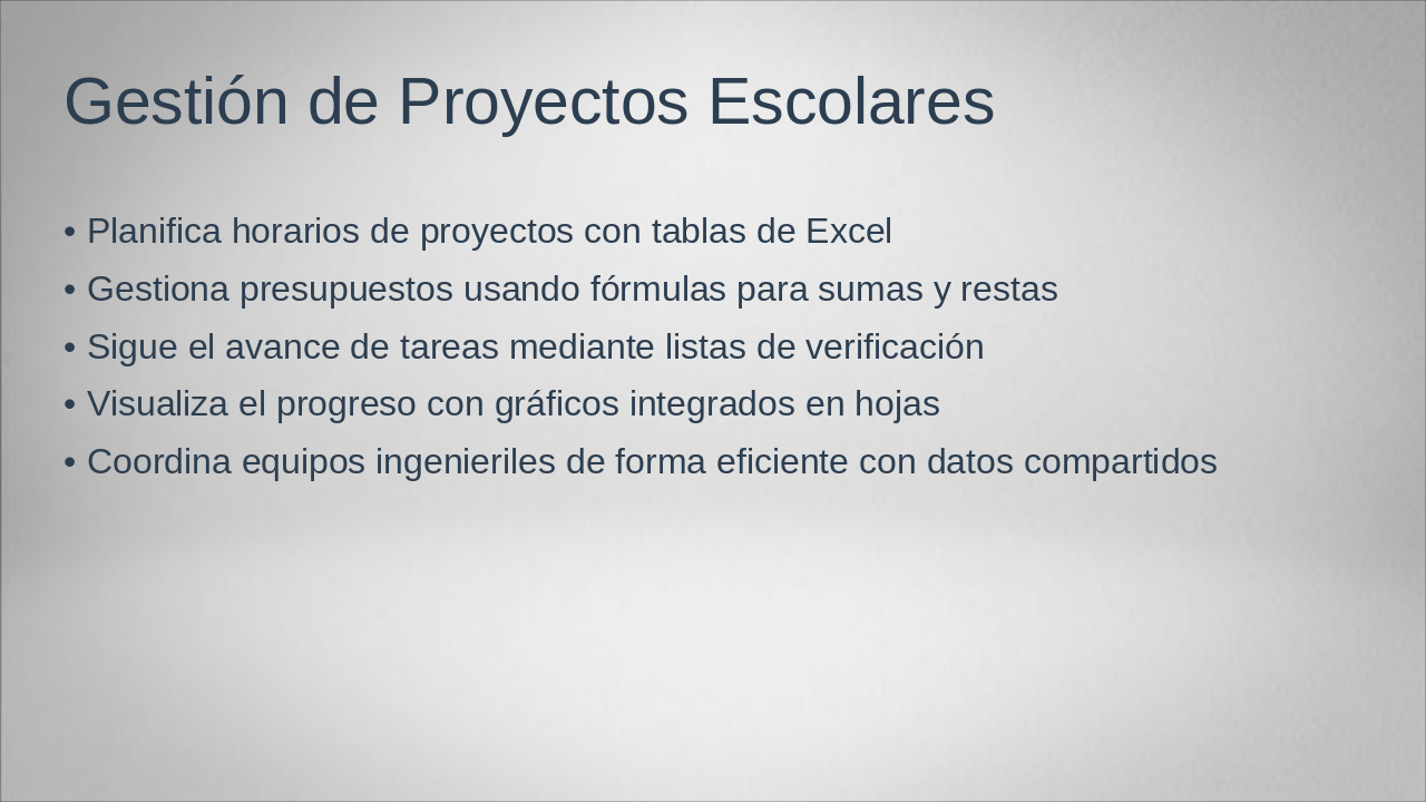 This slide on School Project Management outlines practical Excel-based tools for effective planning and execution. It covers scheduling projects with tables, budgeting via formulas, tracking tasks with checklists, visualizing progress through charts, and coordinating engineering teams with shared data.