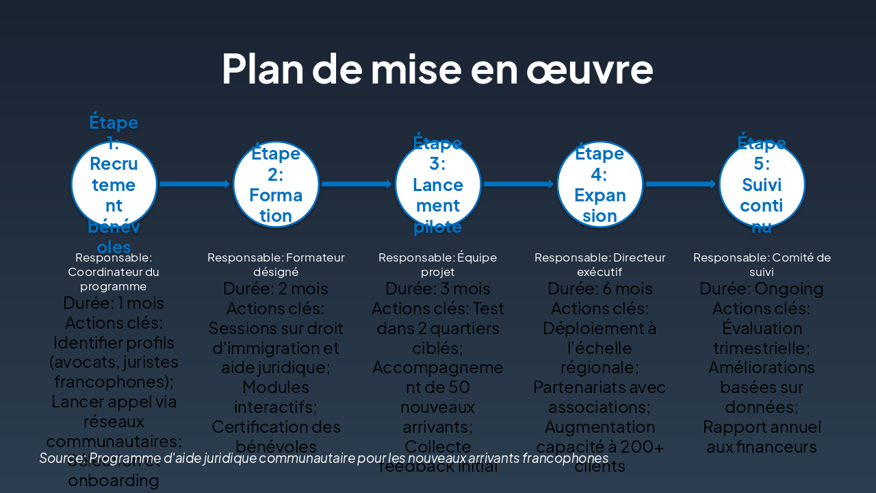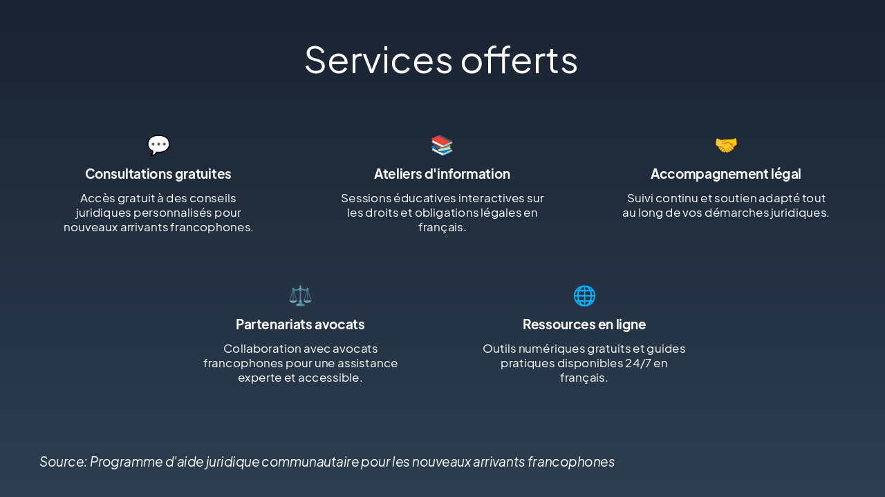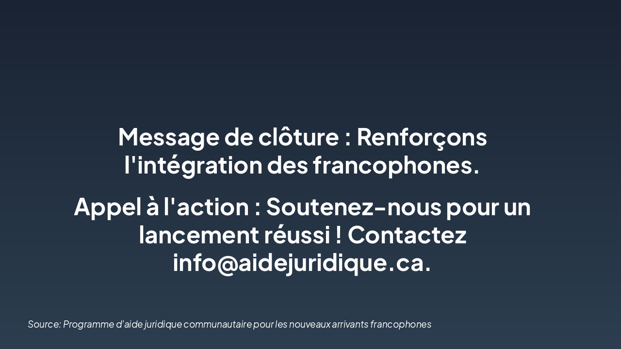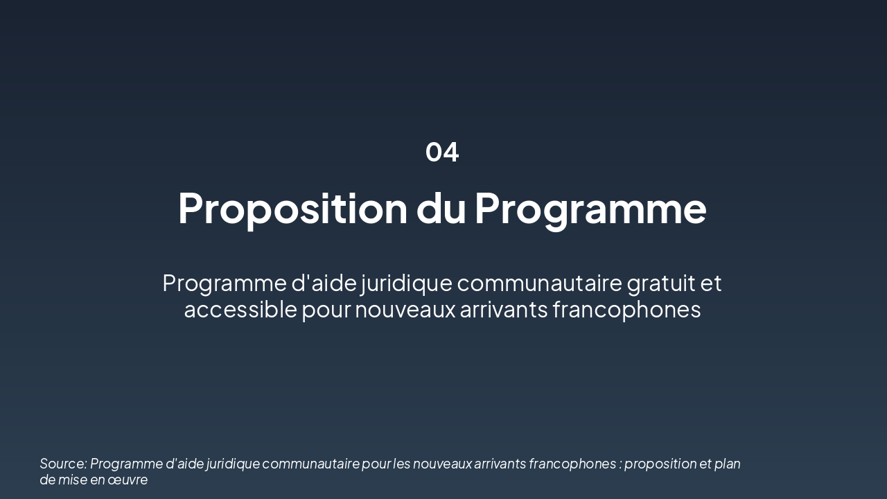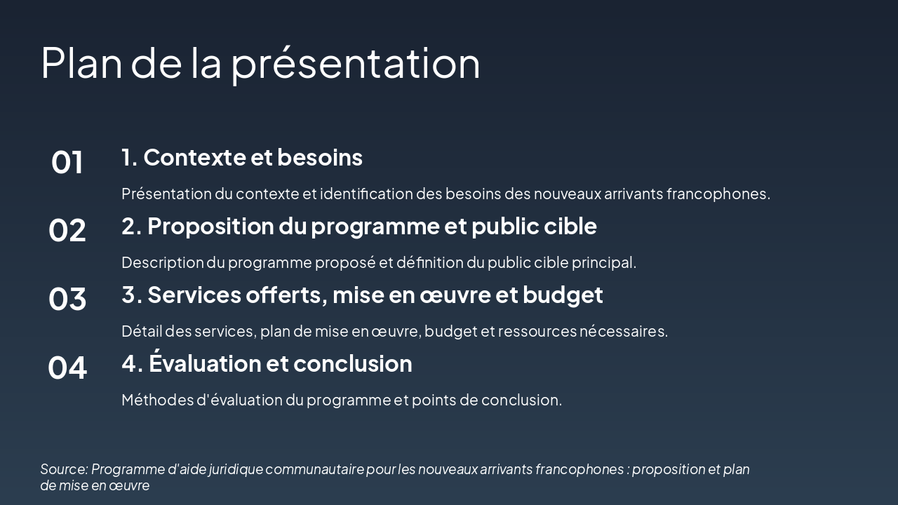 Ce plan de présentation comprend quatre sections principales : le contexte et les besoins des nouveaux arrivants francophones, la proposition du programme et son public cible, les services offerts avec leur mise en œuvre et le budget, ainsi que l'évaluation et la conclusion. Il s'agit d'un agenda structuré pour exposer un programme dédié à ce public.