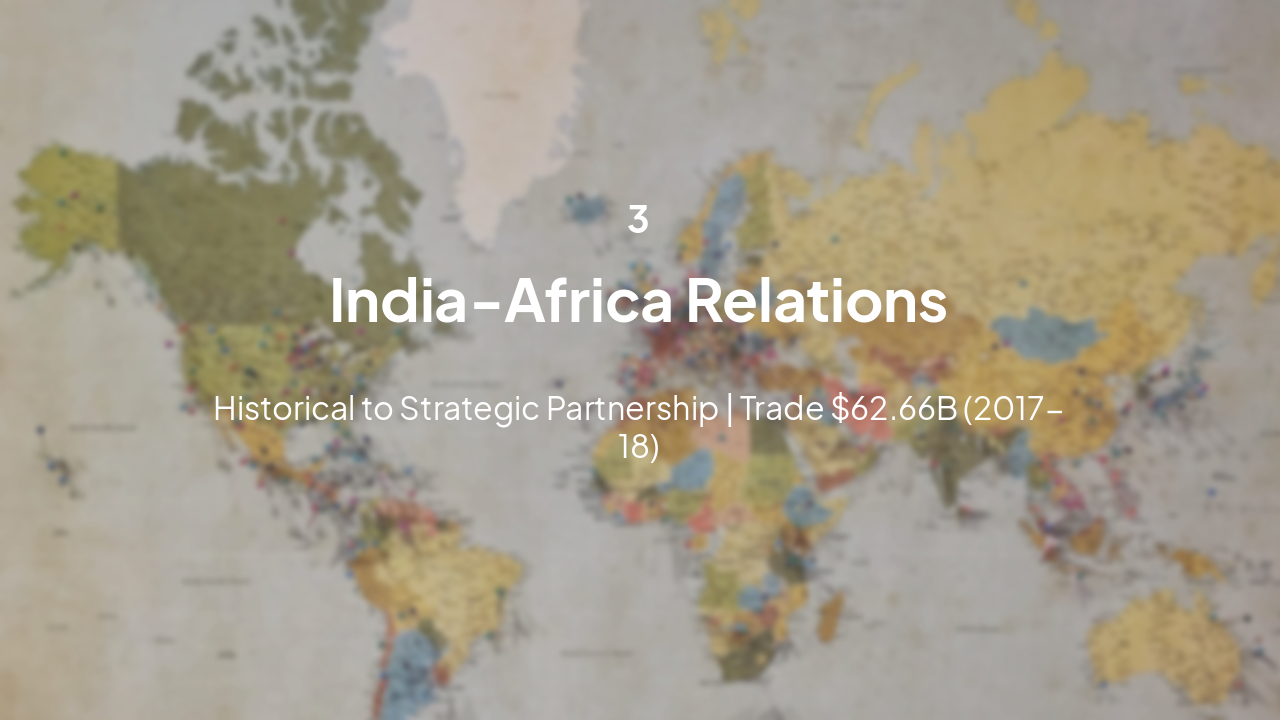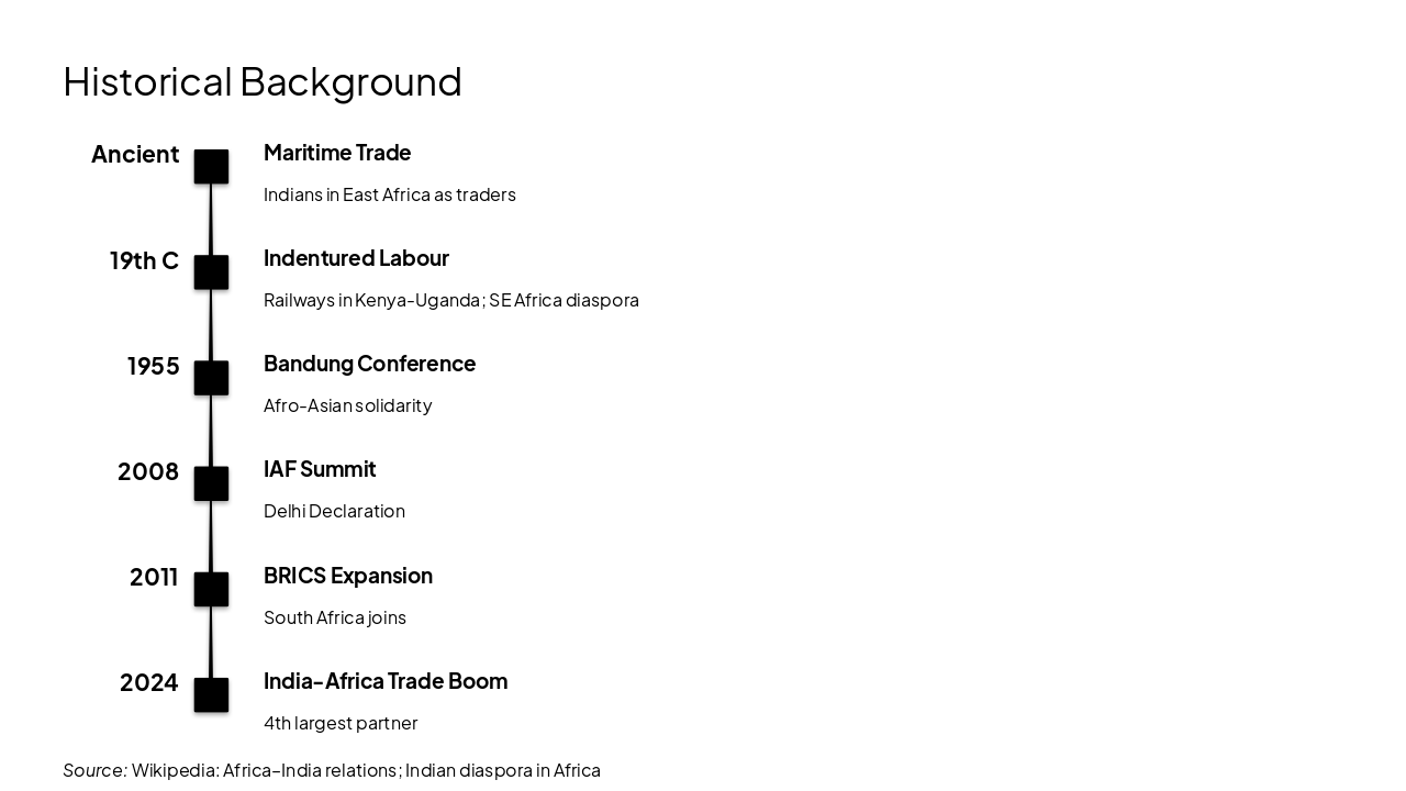 Ancient: Maritime Trade Indians in East Africa as traders 19th C: Indentured Labour Railways in Kenya-Uganda; SE Africa diaspora 1955: Bandung Conference Afro-Asian solidarity 2008: IAF Summit Delhi Declaration 2011: BRICS Expansion South Africa joins 2024: India-Africa Trade Boom 4th largest partner
