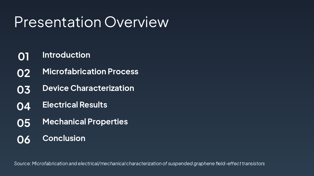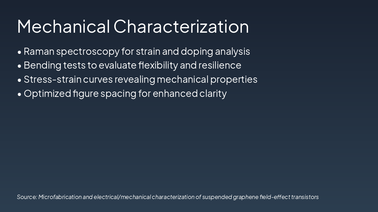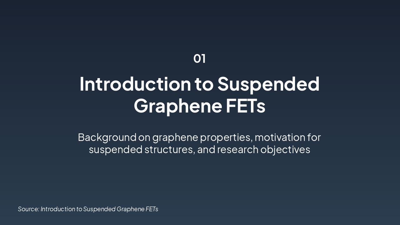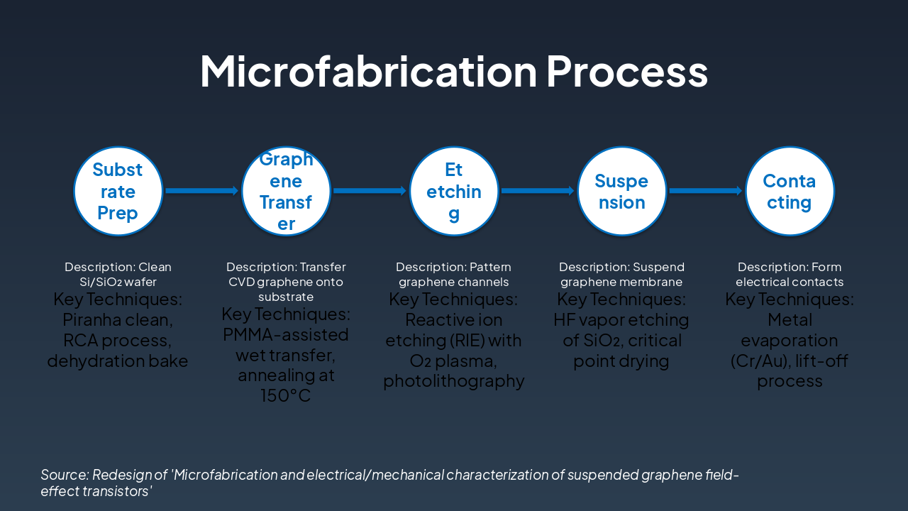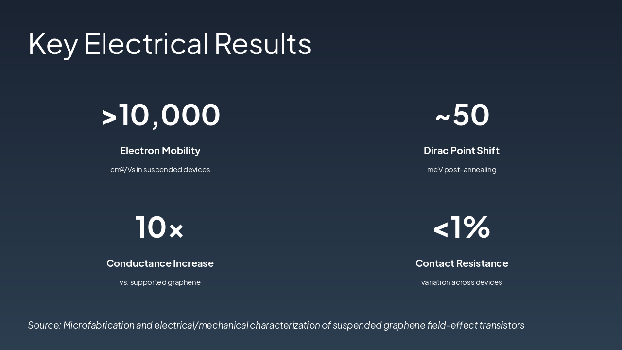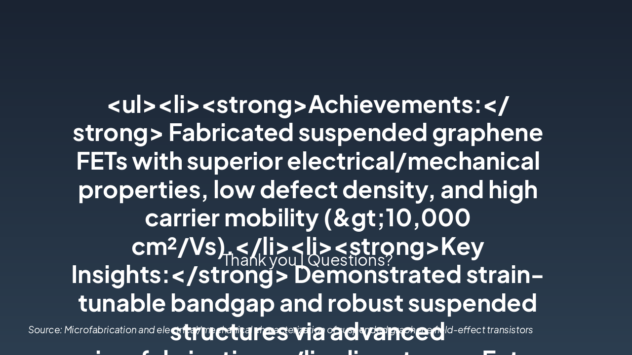 <ul><li><strong>Achievements:</strong> Fabricated suspended graphene FETs with superior electrical/mechanical properties, low defect density, and high carrier mobility (>10,000 cm²/Vs).</li><li><strong>Key Insights:</strong> Demonstrated strain-tunable bandgap and robust suspended structures via advanced microfabrication.</li><li><strong>Future Work:</strong> Scale to arrays, integrate with quantum devices, explore 2D heterostructures.</li></ul><p><strong>Closing:</strong> Graphene FETs pave the way for next-gen nanoelectronics.</p><p><em>Call-to-Action:</em> Contact us to collaborate on cutting-edge 2D materials research.</p>