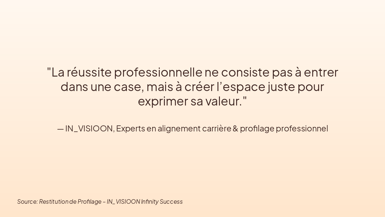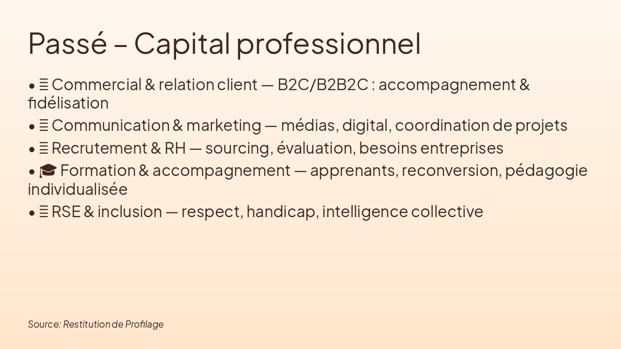 This title slide is titled "Restitution de Profilage." Its subtitle reads: "De l’accumulation d’expériences à un positionnement juste et durable" (From the accumulation of experiences to a fair and sustainable positioning).