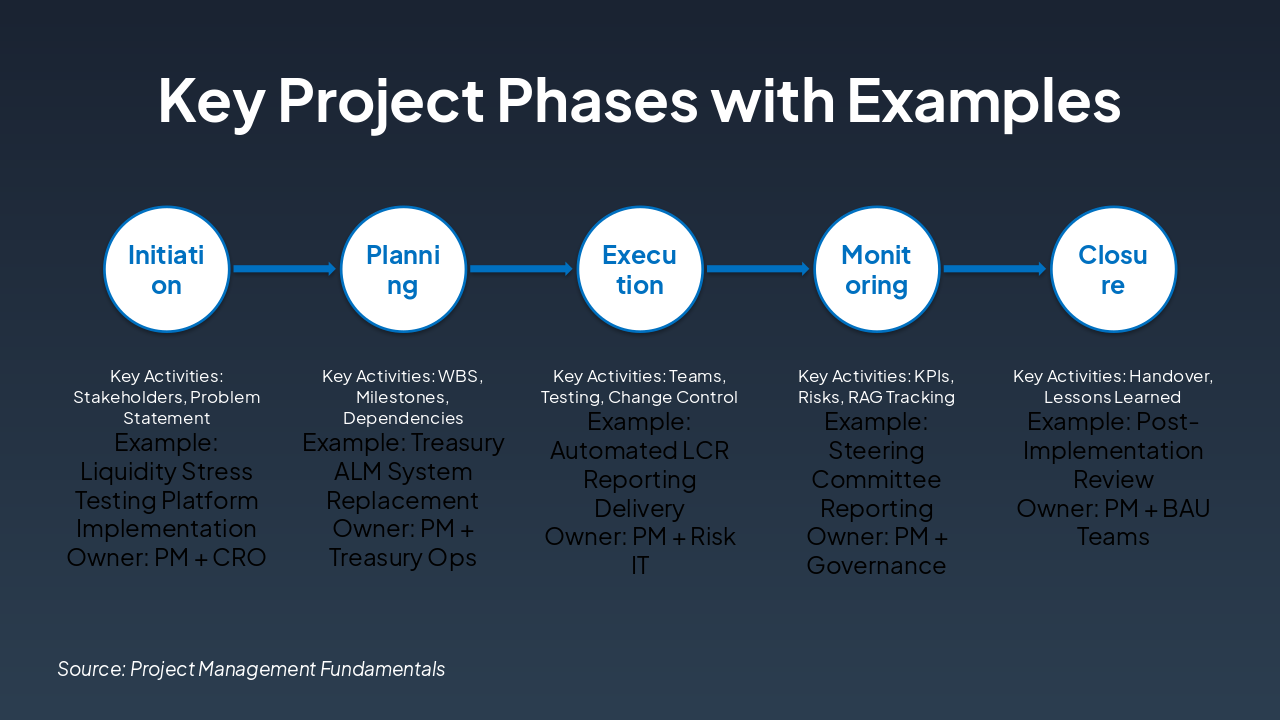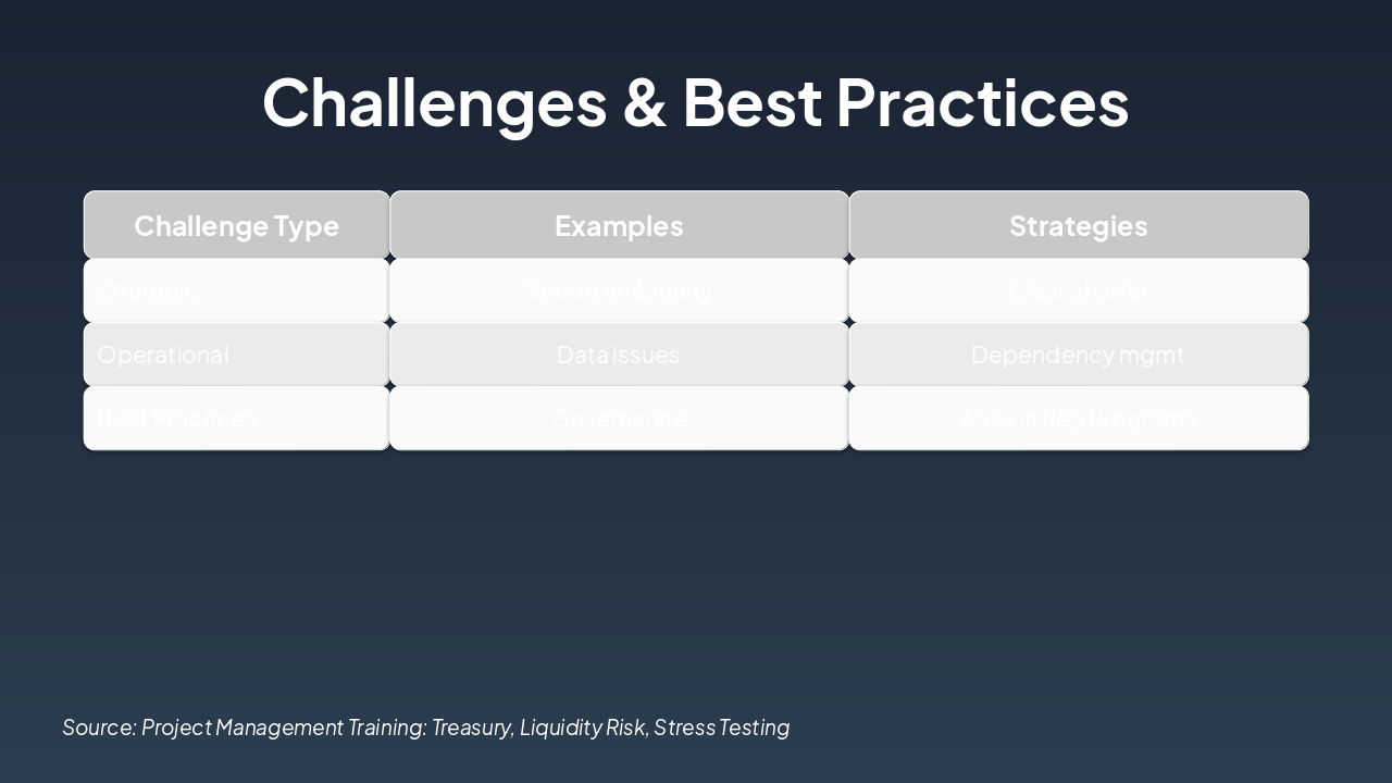 This title slide presents "Comprehensive Project Management Training" focused on "Treasury, Liquidity Risk & Stress Testing." It is a training program targeted at junior to mid-level personnel.