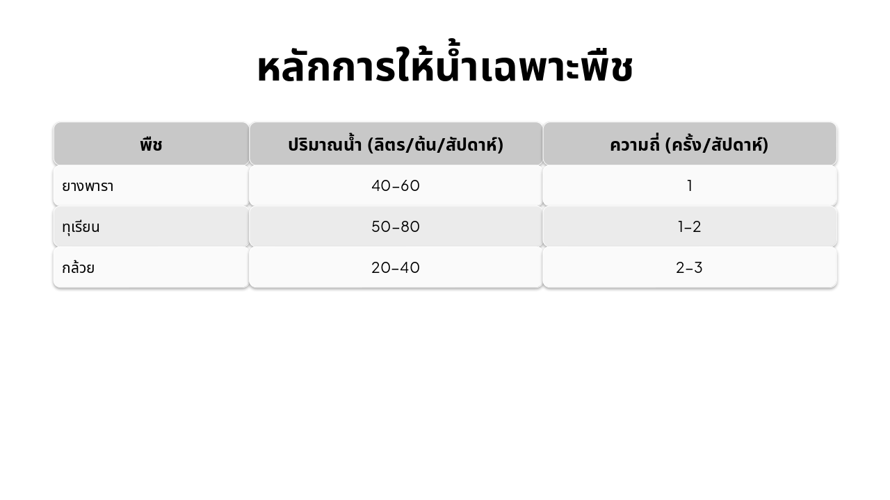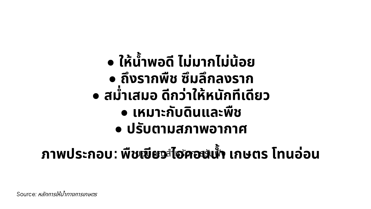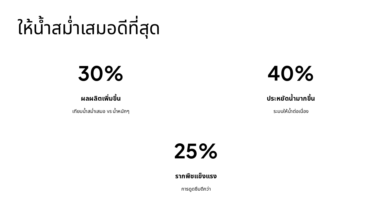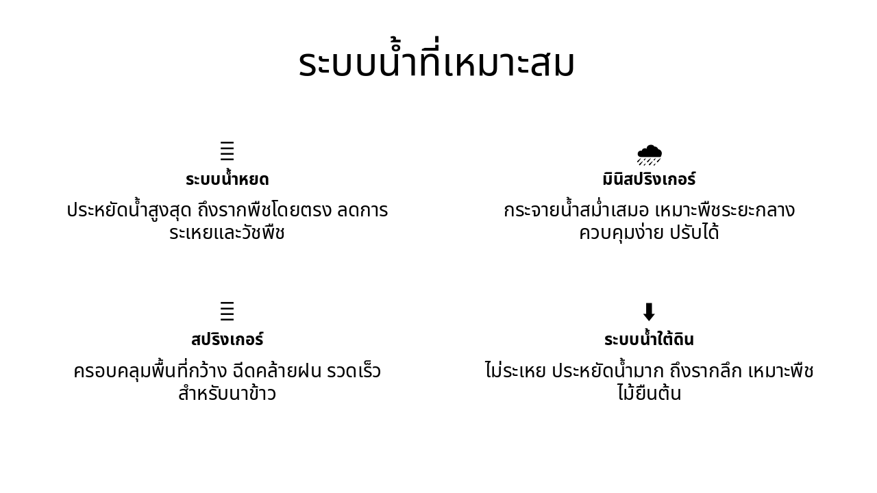 { "features": [ { "icon": "💧", "heading": "ระบบน้ำหยด", "description": "ประหยัดน้ำสูงสุด ถึงรากพืชโดยตรง ลดการระเหยและวัชพืช" }, { "icon": "🌧️", "heading": "มินิสปริงเกอร์", "description": "กระจายน้ำสม่ำเสมอ เหมาะพืชระยะกลาง ควบคุมง่าย ปรับได้" }, { "icon": "🚿", "heading": "สปริงเกอร์", "description": "ครอบคลุมพื้นที่กว้าง ฉีดคล้ายฝน รวดเร็วสำหรับนาข้าว" }, { "icon": "⬇️", "heading": "ระบบน้ำใต้ดิน", "description": "ไม่ระเหย ประหยัดน้ำมาก ถึงรากลึก เหมาะพืชไม้ยืนต้น" } ] }