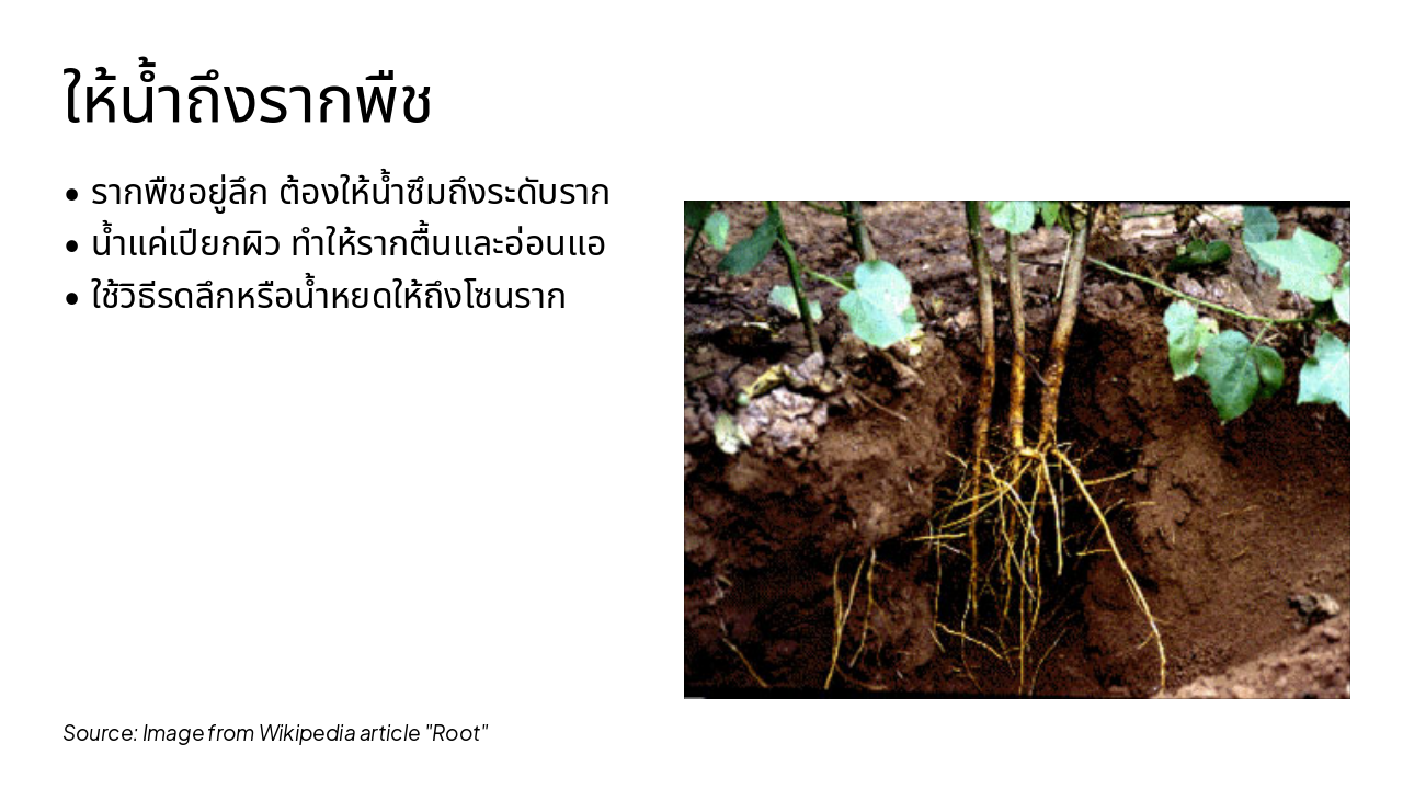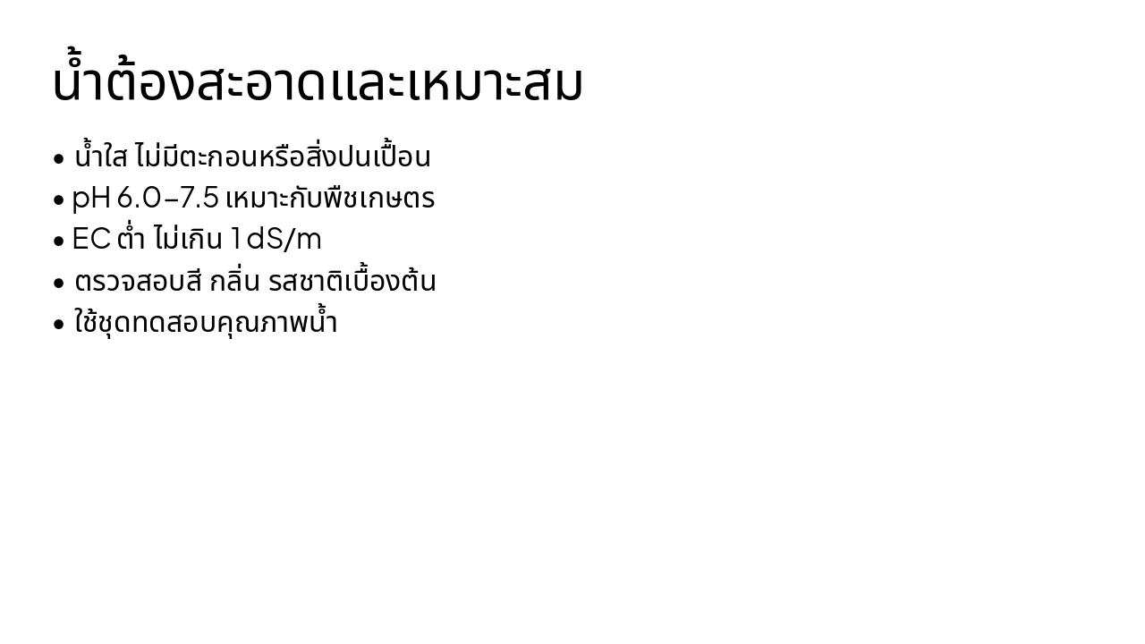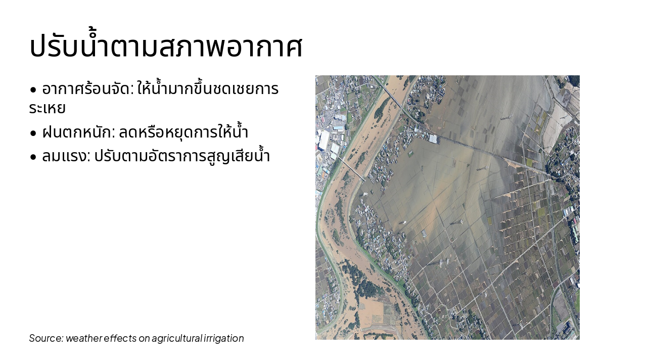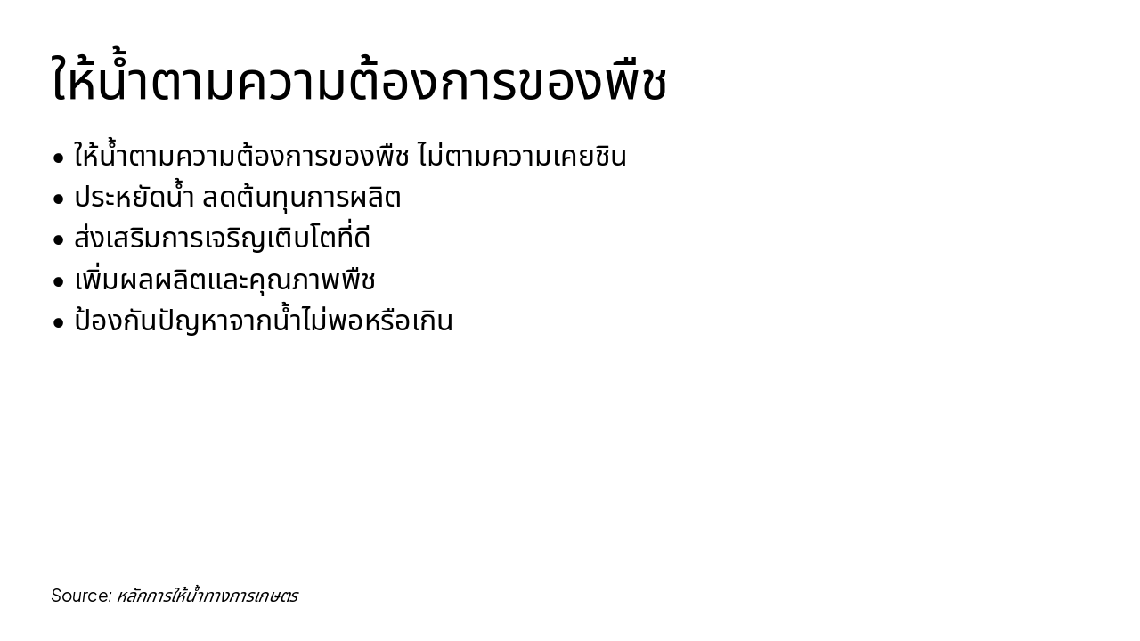 { "features": [ { "icon": "💧", "heading": "ระบบน้ำหยด", "description": "ประหยัดน้ำสูงสุด ถึงรากพืชโดยตรง ลดการระเหยและวัชพืช" }, { "icon": "🌧️", "heading": "มินิสปริงเกอร์", "description": "กระจายน้ำสม่ำเสมอ เหมาะพืชระยะกลาง ควบคุมง่าย ปรับได้" }, { "icon": "🚿", "heading": "สปริงเกอร์", "description": "ครอบคลุมพื้นที่กว้าง ฉีดคล้ายฝน รวดเร็วสำหรับนาข้าว" }, { "icon": "⬇️", "heading": "ระบบน้ำใต้ดิน", "description": "ไม่ระเหย ประหยัดน้ำมาก ถึงรากลึก เหมาะพืชไม้ยืนต้น" } ] }