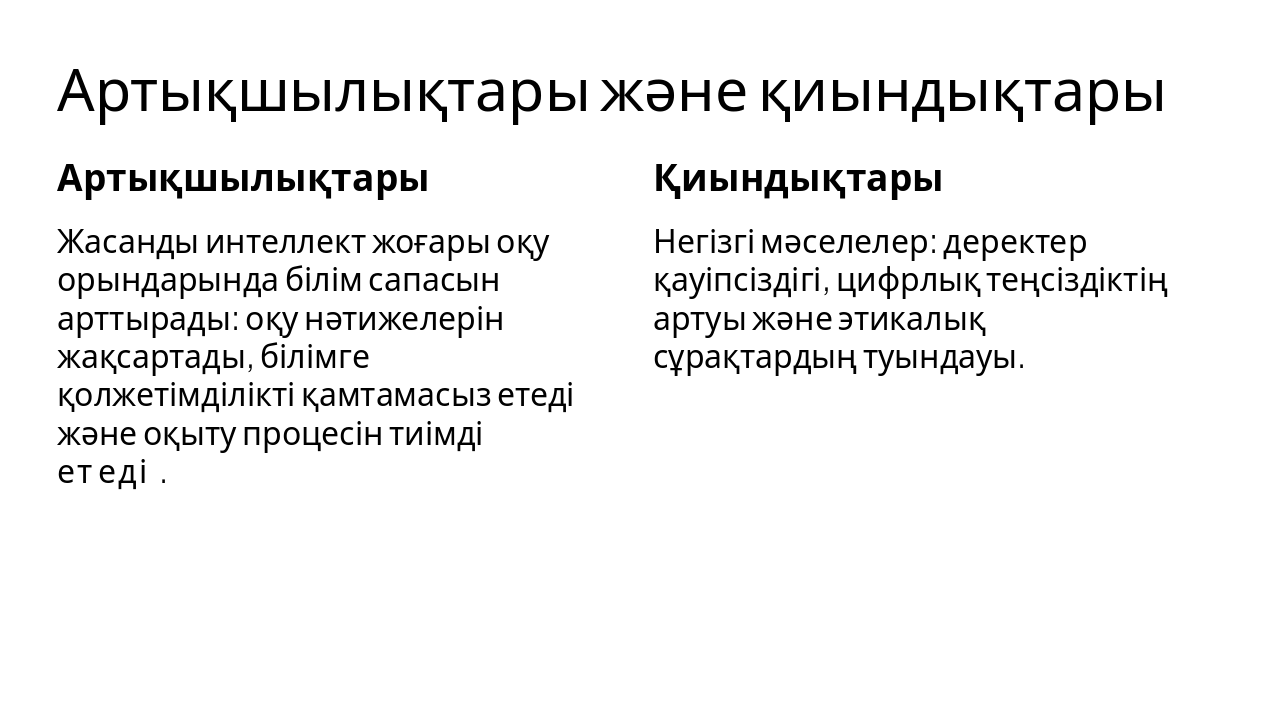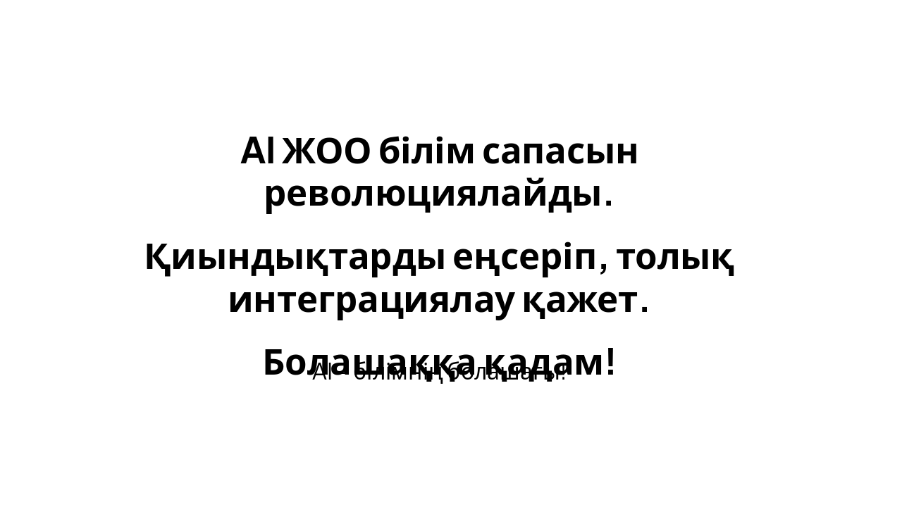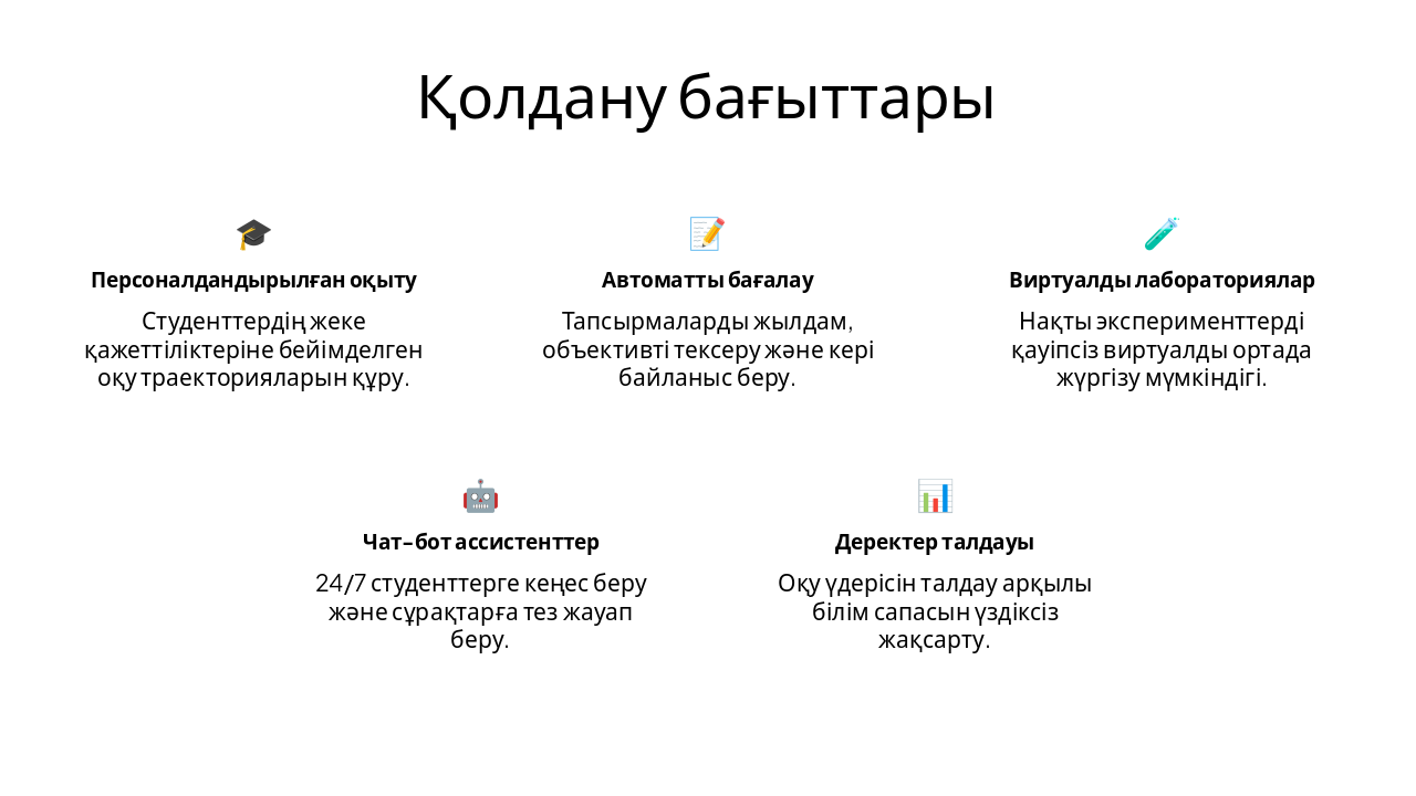 { "features": [ { "icon": "🎓", "heading": "Персоналдандырылған оқыту", "description": "Студенттердің жеке қажеттіліктеріне бейімделген оқу траекторияларын құру." }, { "icon": "📝", "heading": "Автоматты бағалау", "description": "Тапсырмаларды жылдам, объективті тексеру және кері байланыс беру." }, { "icon": "🧪", "heading": "Виртуалды лабораториялар", "description": "Нақты эксперименттерді қауіпсіз виртуалды ортада жүргізу мүмкіндігі." }, { "icon": "🤖", "heading": "Чат-бот ассистенттер", "description": "24/7 студенттерге кеңес беру және сұрақтарға тез жауап беру." }, { "icon": "📊", "heading": "Деректер талдауы", "description": "Оқу үдерісін талдау арқылы білім сапасын үздіксіз жақсарту." } ] }