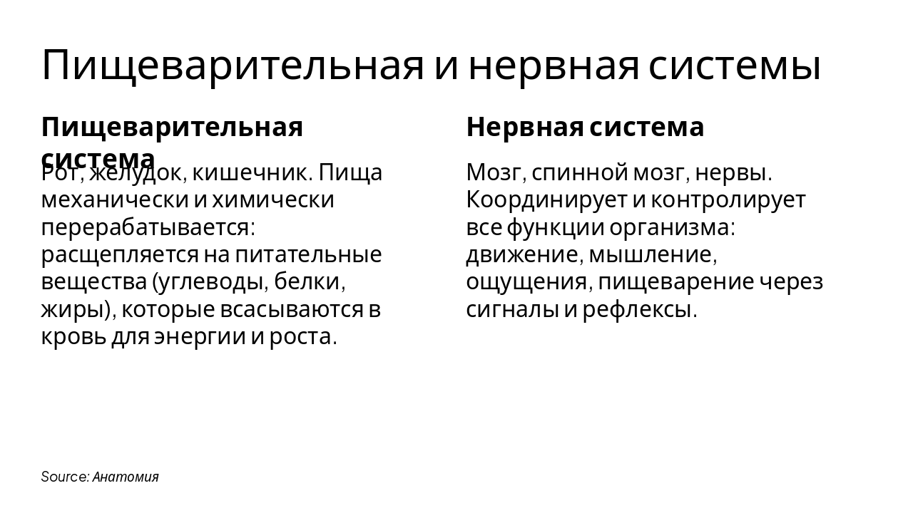 | Рот, желудок, кишечник. Пища механически и химически перерабатывается: расщепляется на питательные вещества (углеводы, белки, жиры), которые всасываются в кровь для энергии и роста. | Мозг, спинной мозг, нервы. Координирует и контролирует все функции организма: движение, мышление, ощущения, пищеварение через сигналы и рефлексы. |