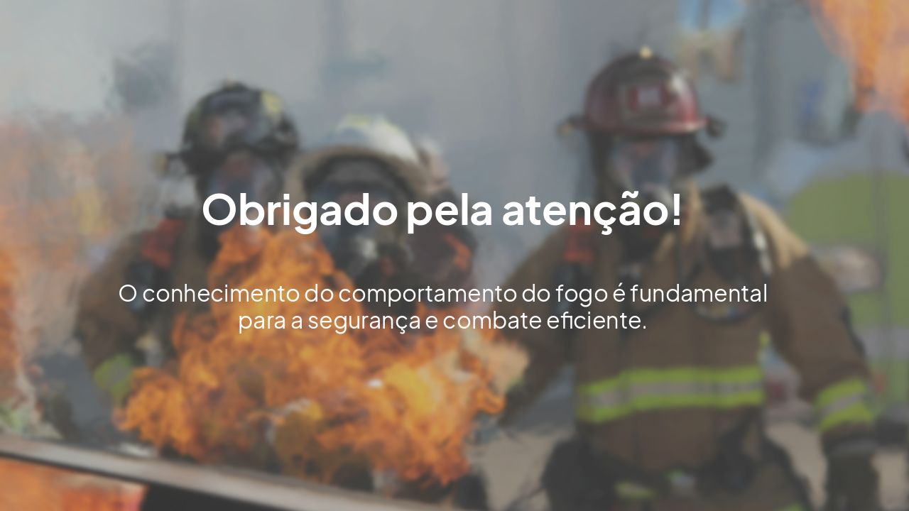 Crie um slide chamativo sobre as 5 fases do fogo. Use fonte Arial, com tamanho grande e bem visível. Coloque o título: “Fases do Fogo”. Introdução sobre o fogo nos próximos slide fala sobra cada uma delas: Fase inicial Queima livre Flashover Queima lenta Backdraft Adicione também uma conclusão curta. Use imagens chamativas Finalize o slide com a frase: “Obrigado pela atenção!”