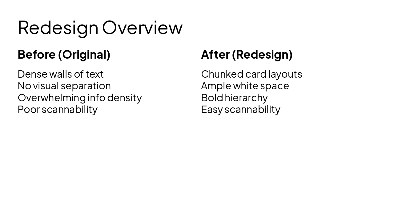 After (Redesign) Chunked card layouts Ample white space Bold hierarchy Easy scannability