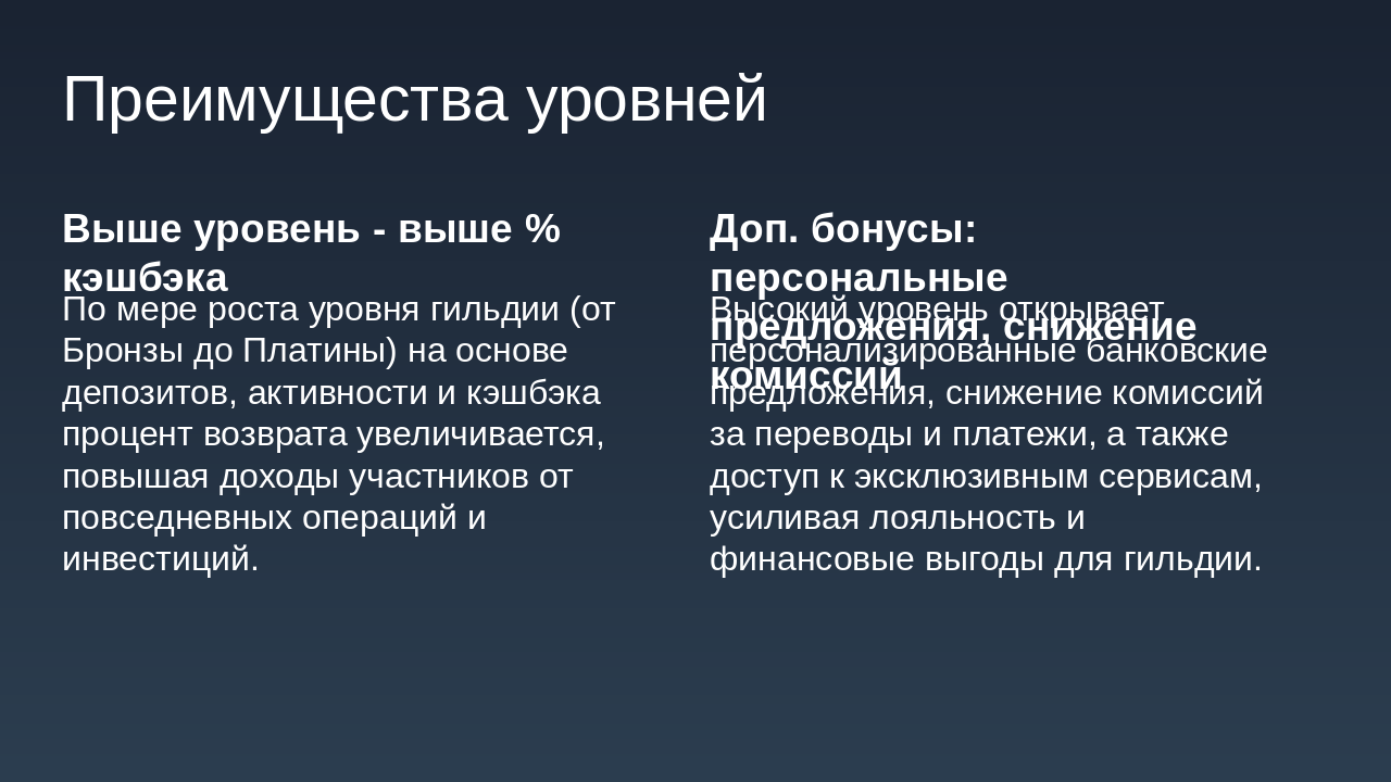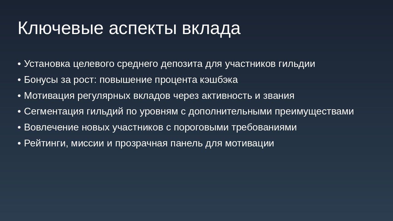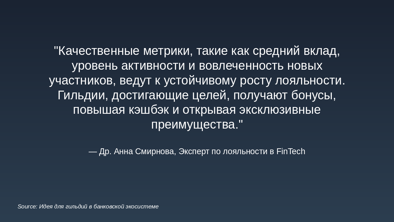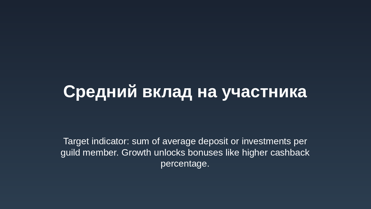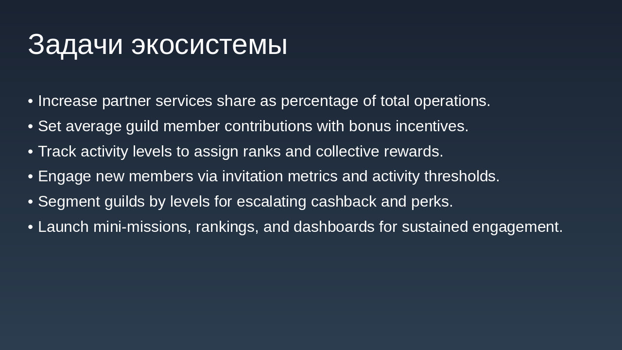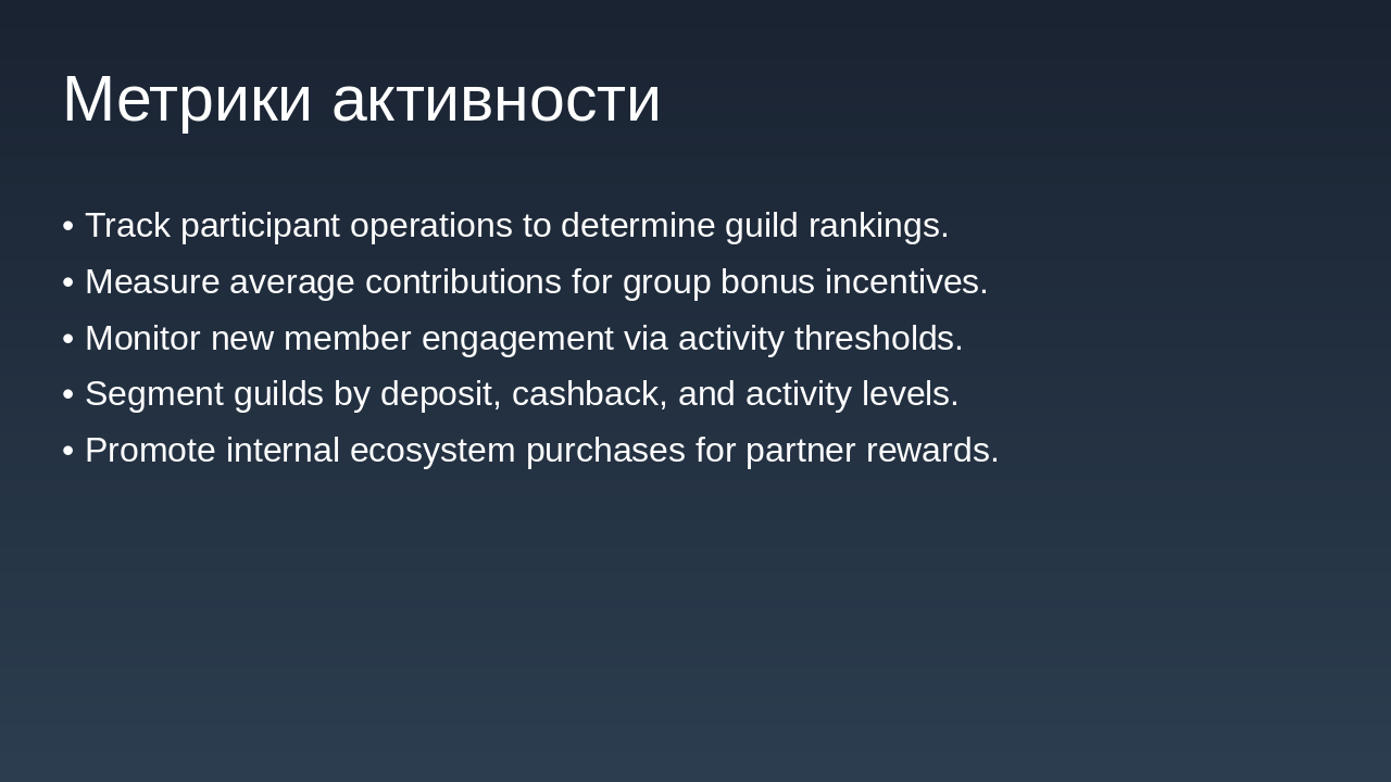 Уровни: Бронза, Серебро, Золото, Платина. Зависят от депозита + кэшбэка + активности. Средний вклад на участника гильдии: Устанавливается целевой показатель: сумма среднего депозита или инвестиций участника гильдии. По достижению рост среднего вклада, гильдия получает бонусы (например, повышение % кэшбэка). Уровень активности участников: Количество операций (например, переводов, платежей, покупок) каждым участником в течение периода. Привязка уровня активности к званию участника гильдии и к общему бонусу гильдии. Вовлечённость новых участников: Условие: приглашать можно только новых участников с условием, например, наличия депозитного уровня «Сильвер» (или эквивалент). Можно вести метрику: количество приглашённых с активностью или депозитом выше порога. По достижению определённого числа приглашённых/активных членов — дополнительная награда гильдии. Сегментация по уровням гильдии: Определить уровни гильдии (например: Бронза, Серебро, Золото, Платина) в зависимости от общей суммы депозита + кэшбэка + активности. Чем выше уровень, тем выше процент кэшбэка + дополнительные преимущества (например, персональные предложения банка, снижение комиссии и пр.). Внутренняя экосистема и партнёрства: Покупки внутри экосистемы: могут быть партнерские сервисы банка (страхование, инвестиции, брокерские услуги). Отдельная цель: увеличение доли покупок/услуг внутри партнёрской экосистемы. Можно добавить задачу: “доля услуг партнёров от общего объёма операций гильдии”. Награды за качественные показатели: Рост доли безналичных операций членов гильдии через банк. Сезонные или квартальные рейтинги гильдий: Выводится рейтинг среди всех гильдий банка (или партнёрской сети) по ключевым метрикам: депозит, кэшбэк, активность, внутренняя экосистема. Победившие гильдии получают бонус процент к кэшбэку или эксклюзивные банковские мерчи. Мини миссии и челленджи: Краткосрочные задачи: за неделю/месяц выполнить минимальный порог операций, привлечь нового участника, сделать покупку у партнёра и т.д. Это мотивирует регулярную активность, а не только пассивное накопление. Прозрачная панель управления: Банку и участникам гильдии целесообразно иметь интерфейс (в банкинге или приложении) с показателями: текущий депозит гильдии, кэшбэк, уровень гильдии, достижения. Это усиливает чувство принадлежности и игрового элемента.