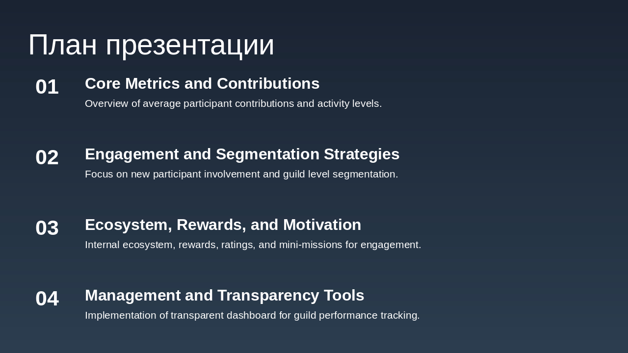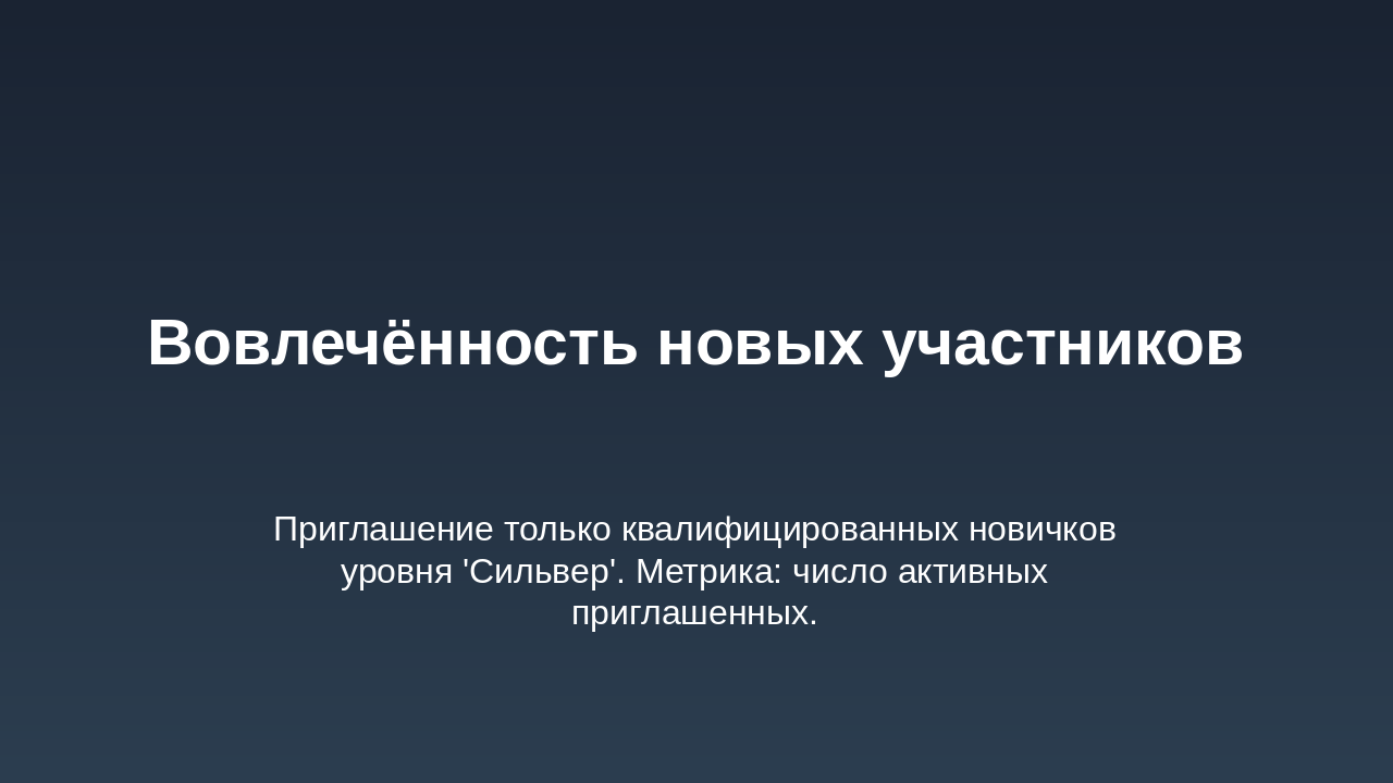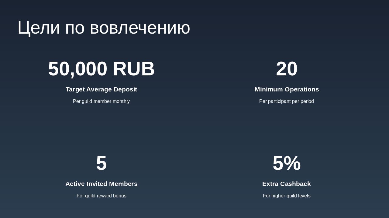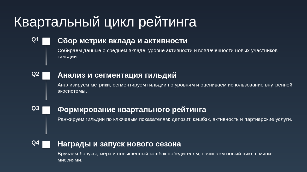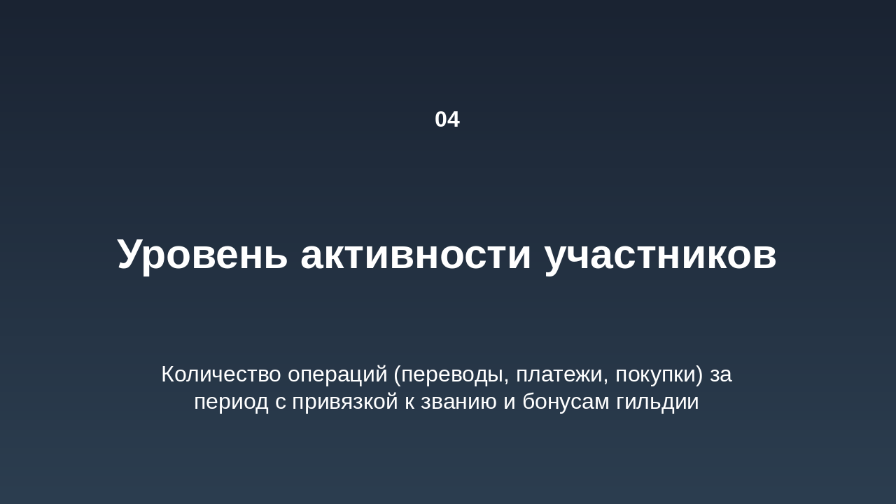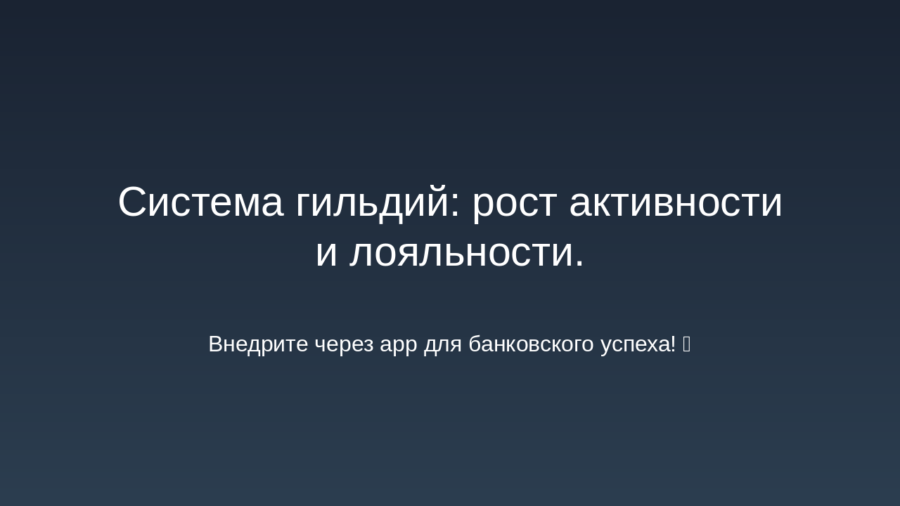 Уровни: Бронза, Серебро, Золото, Платина. Зависят от депозита + кэшбэка + активности. Средний вклад на участника гильдии: Устанавливается целевой показатель: сумма среднего депозита или инвестиций участника гильдии. По достижению рост среднего вклада, гильдия получает бонусы (например, повышение % кэшбэка). Уровень активности участников: Количество операций (например, переводов, платежей, покупок) каждым участником в течение периода. Привязка уровня активности к званию участника гильдии и к общему бонусу гильдии. Вовлечённость новых участников: Условие: приглашать можно только новых участников с условием, например, наличия депозитного уровня «Сильвер» (или эквивалент). Можно вести метрику: количество приглашённых с активностью или депозитом выше порога. По достижению определённого числа приглашённых/активных членов — дополнительная награда гильдии. Сегментация по уровням гильдии: Определить уровни гильдии (например: Бронза, Серебро, Золото, Платина) в зависимости от общей суммы депозита + кэшбэка + активности. Чем выше уровень, тем выше процент кэшбэка + дополнительные преимущества (например, персональные предложения банка, снижение комиссии и пр.). Внутренняя экосистема и партнёрства: Покупки внутри экосистемы: могут быть партнерские сервисы банка (страхование, инвестиции, брокерские услуги). Отдельная цель: увеличение доли покупок/услуг внутри партнёрской экосистемы. Можно добавить задачу: “доля услуг партнёров от общего объёма операций гильдии”. Награды за качественные показатели: Рост доли безналичных операций членов гильдии через банк. Сезонные или квартальные рейтинги гильдий: Выводится рейтинг среди всех гильдий банка (или партнёрской сети) по ключевым метрикам: депозит, кэшбэк, активность, внутренняя экосистема. Победившие гильдии получают бонус процент к кэшбэку или эксклюзивные банковские мерчи. Мини миссии и челленджи: Краткосрочные задачи: за неделю/месяц выполнить минимальный порог операций, привлечь нового участника, сделать покупку у партнёра и т.д. Это мотивирует регулярную активность, а не только пассивное накопление. Прозрачная панель управления: Банку и участникам гильдии целесообразно иметь интерфейс (в банкинге или приложении) с показателями: текущий депозит гильдии, кэшбэк, уровень гильдии, достижения. Это усиливает чувство принадлежности и игрового элемента.