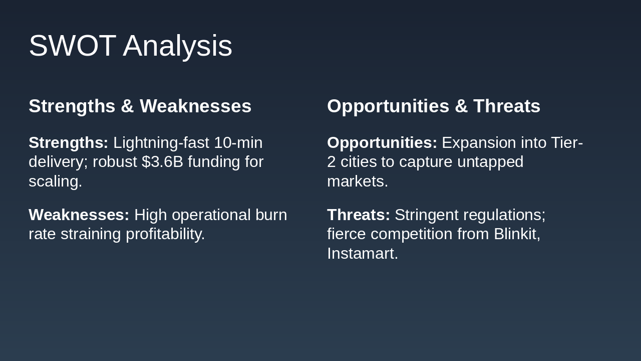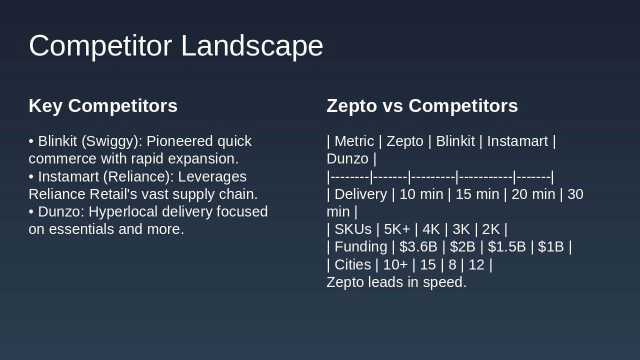 • Zepto holds a strong market position with positive customer sentiment and competitive edge