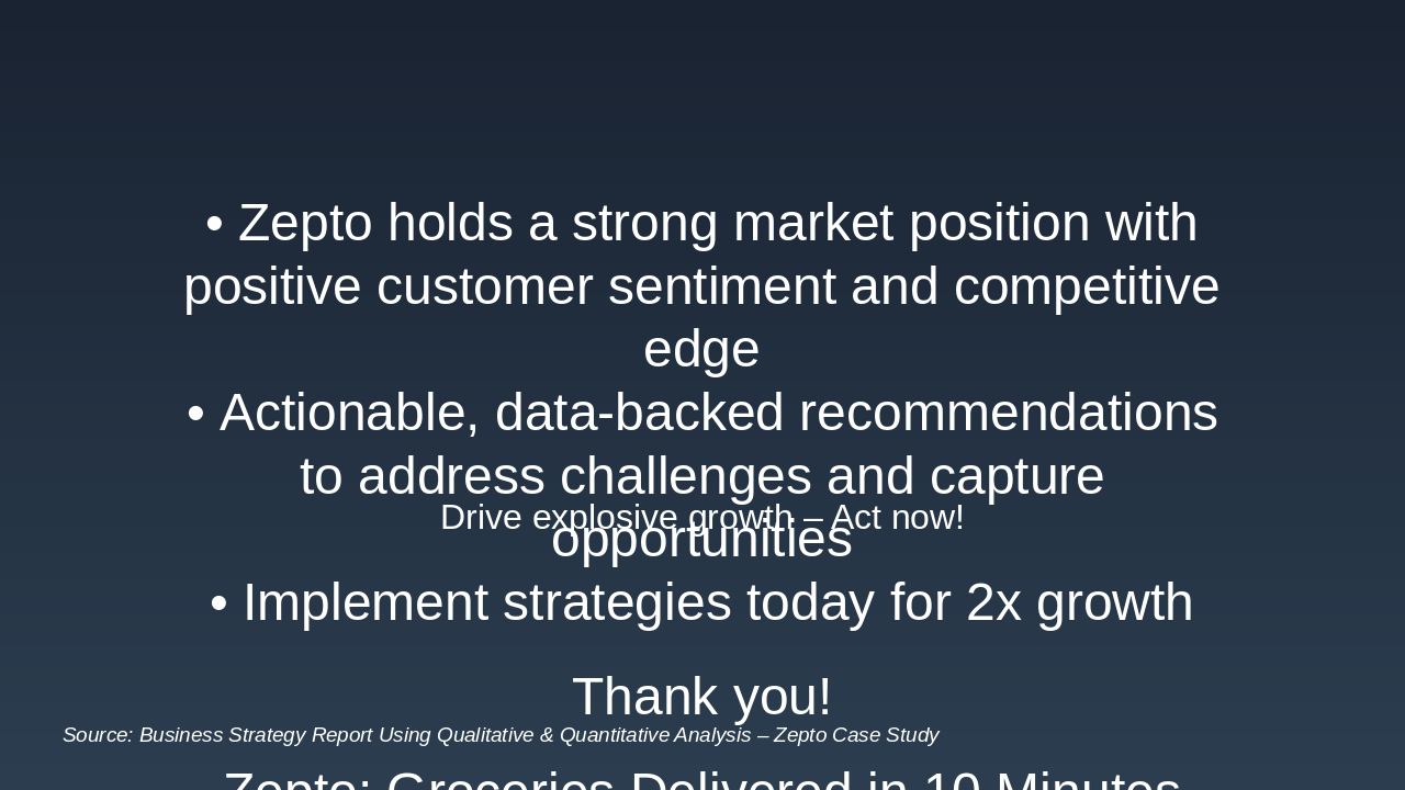 Zepto boasts a strong market position with positive customer sentiment and a competitive edge, alongside actionable, data-backed recommendations to tackle challenges and seize opportunities. The slide urges immediate strategy implementation for 2x growth, closing with thanks and the tagline "Zepto: Groceries Delivered in 10 Minutes" under "Drive explosive growth – Act now!"