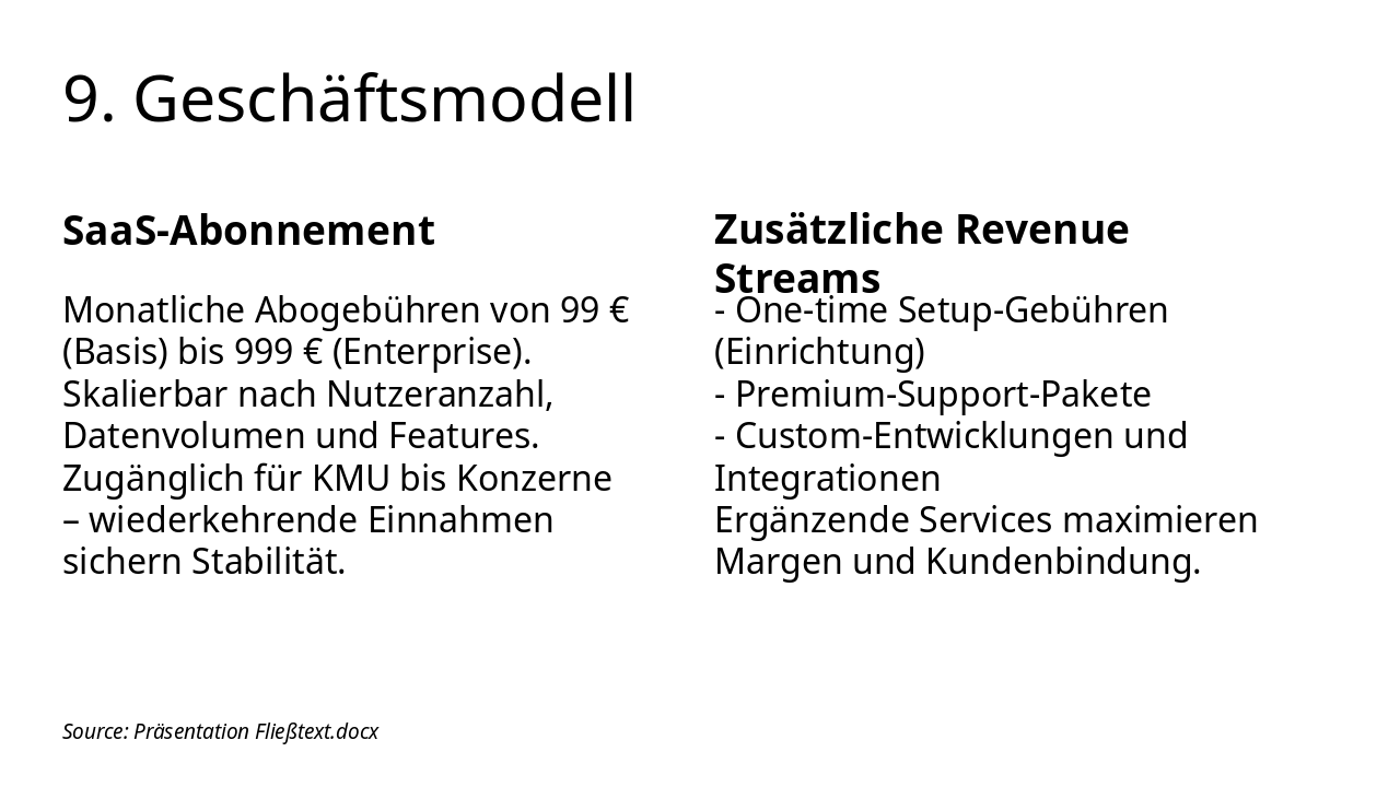| Monatliche Abogebühren von 99 € (Basis) bis 999 € (Enterprise). Skalierbar nach Nutzeranzahl, Datenvolumen und Features. Zugänglich für KMU bis Konzerne – wiederkehrende Einnahmen sichern Stabilität. | - One-time Setup-Gebühren (Einrichtung)
