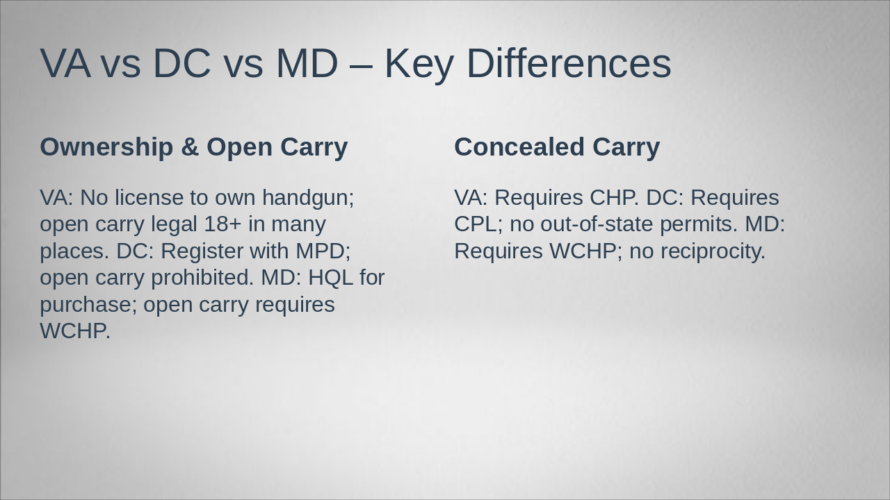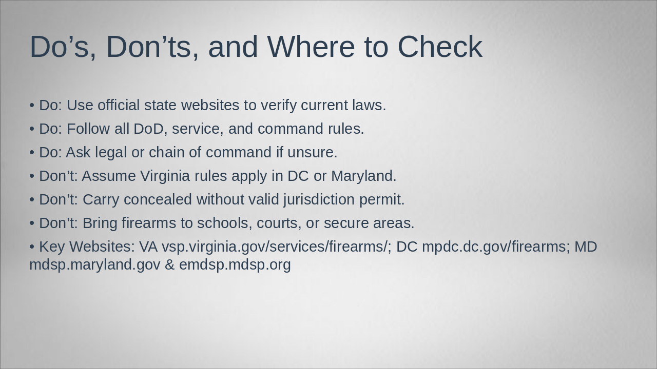 - Key Websites: VA vsp.virginia.gov/services/firearms/; DC mpdc.dc.gov/firearms; MD mdsp.maryland.gov & emdsp.mdsp.org