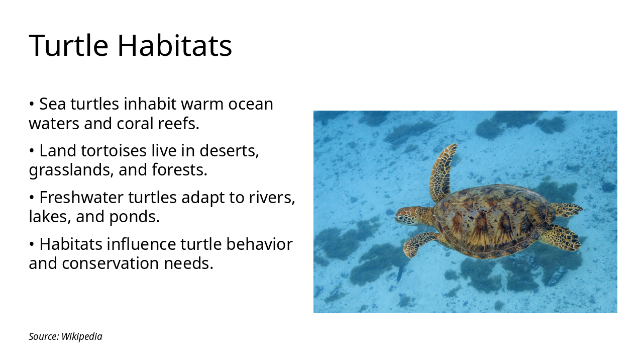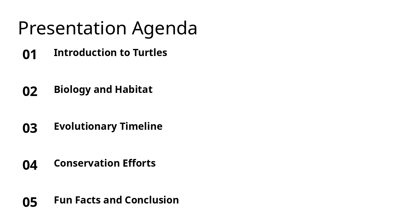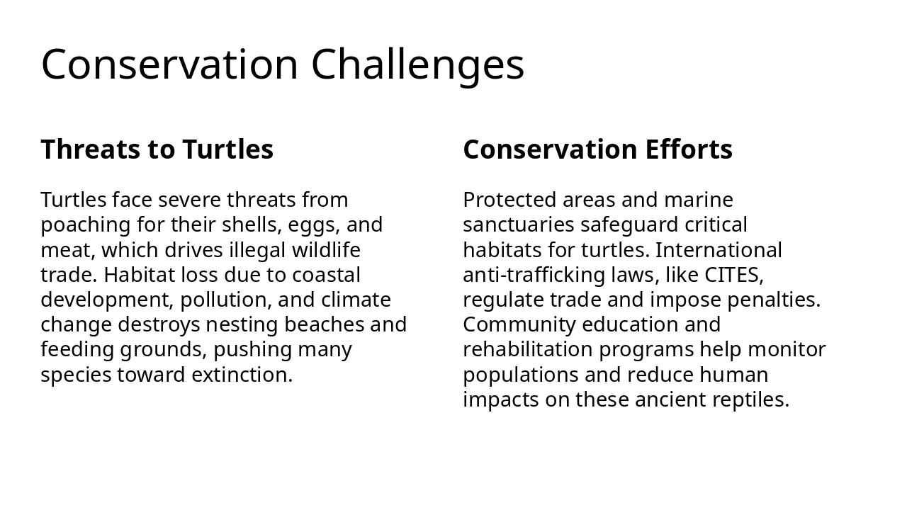 The evolutionary timeline of turtles begins 220 million years ago in the Late Triassic period with the emergence of the first turtles, followed by the adaptation of sea turtles to ocean life around 100 million years ago during the Cretaceous, when they developed flippers for swimming. Today, 356 turtle species thrive worldwide but face significant conservation challenges due to habitat loss.