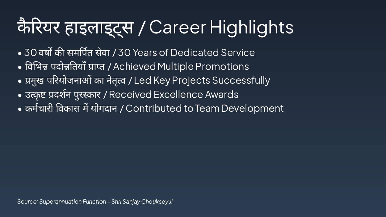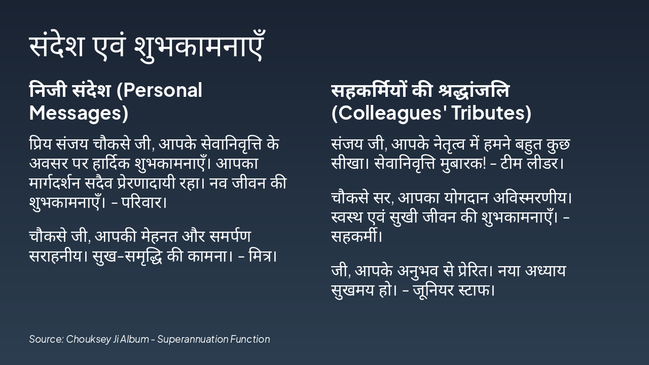 यह स्लाइड सेवानिवृत्ति हो रहे संजय चौकसे जी के लिए संदेश एवं शुभकामनाओं पर आधारित है। बाएँ भाग में परिवार और मित्रों के निजी संदेश हैं, जबकि दाएँ भाग में सहकर्मियों और टीम की श्रद्धांजलि एवं शुभकामनाएँ दी गई हैं।