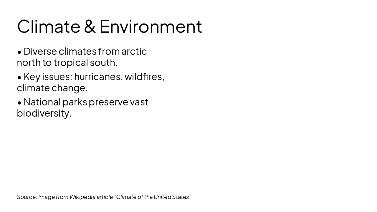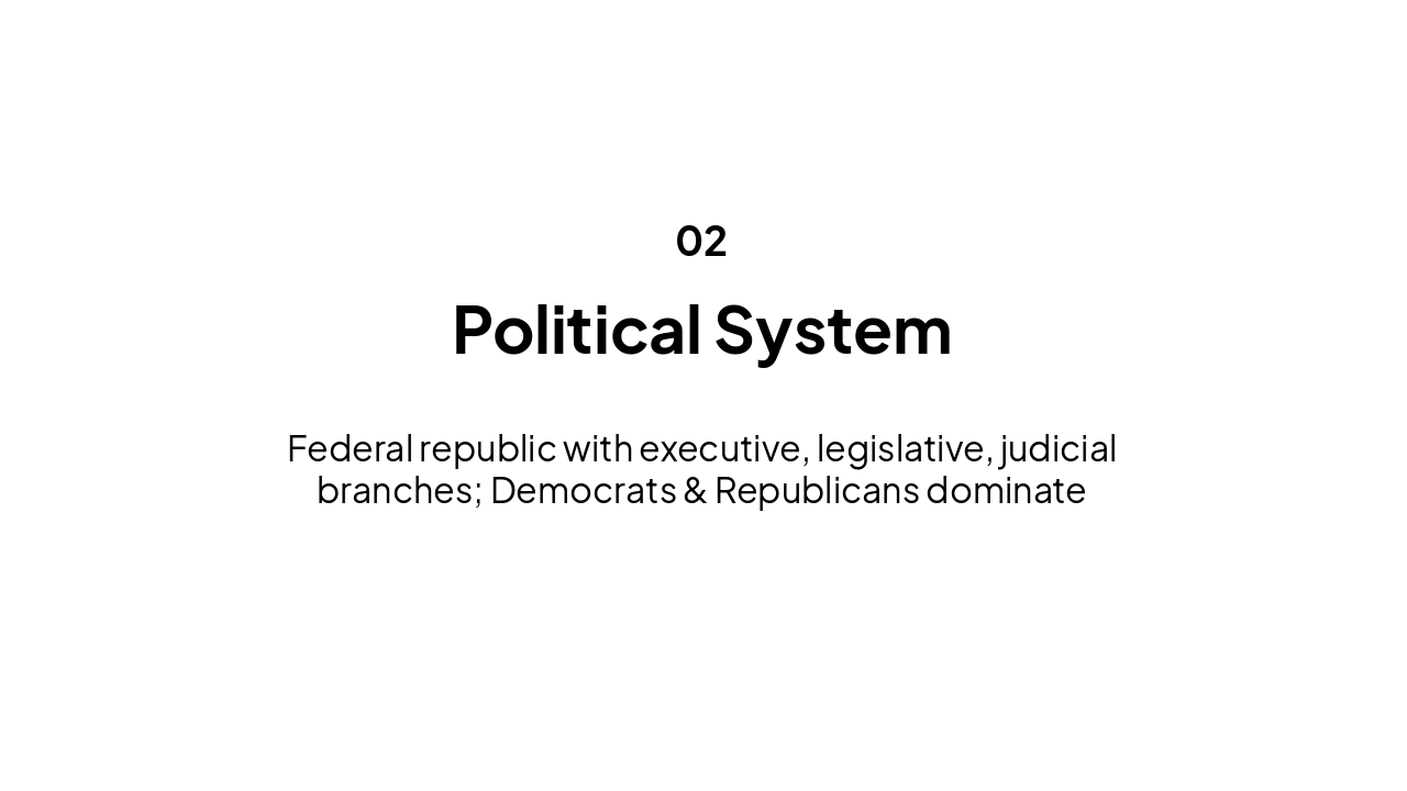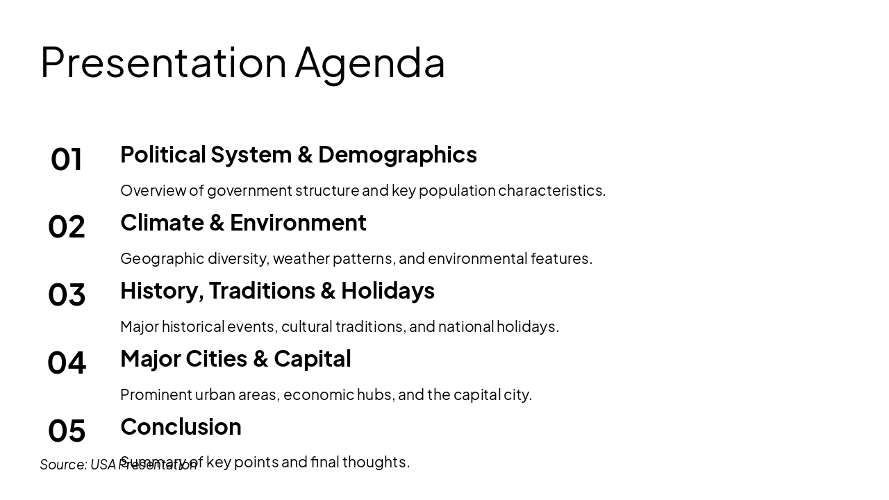 This agenda slide outlines a presentation covering political system and demographics, climate and environment, history, traditions and holidays, major cities and capital, and a concluding summary. Each topic includes a brief description of its focus, such as government structures, geographic features, cultural events, and urban hubs.