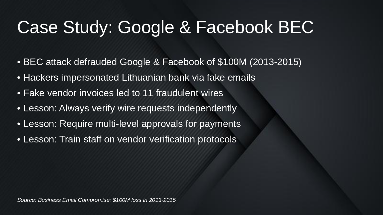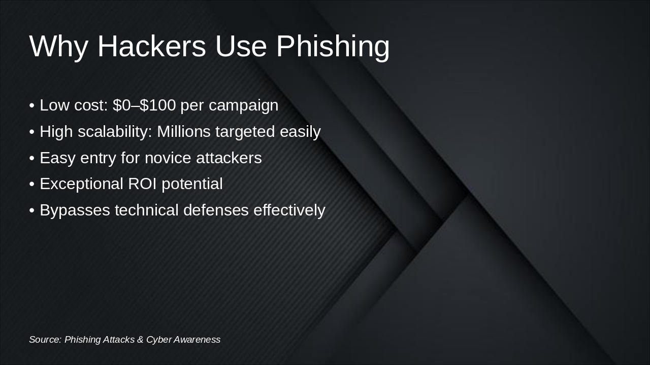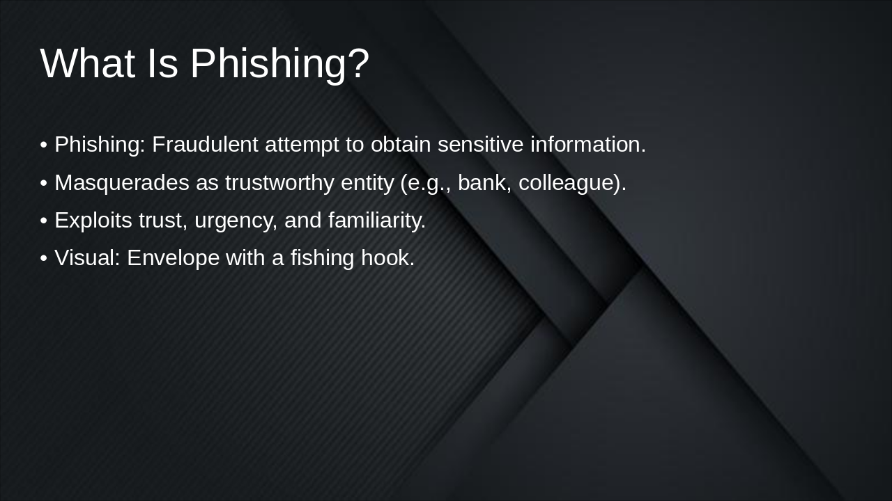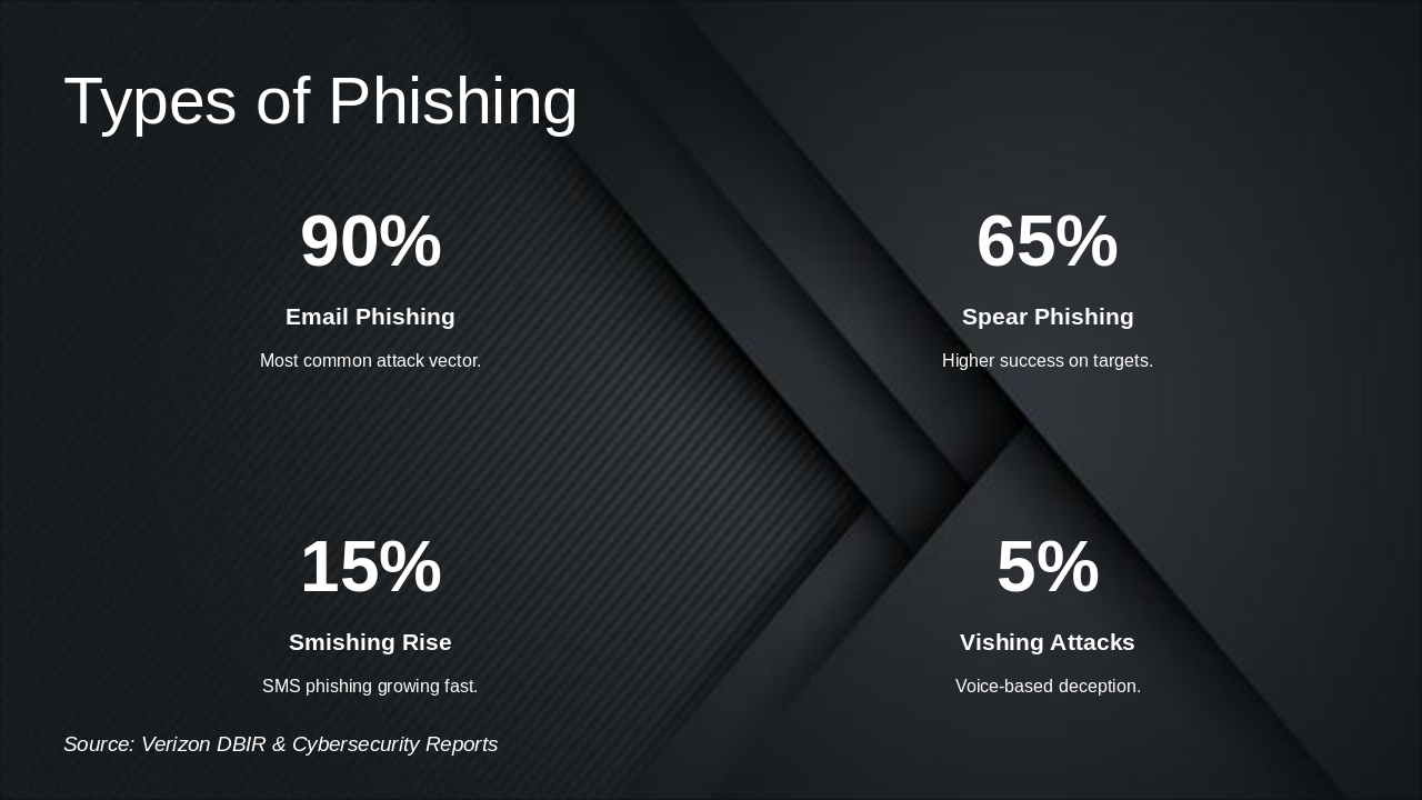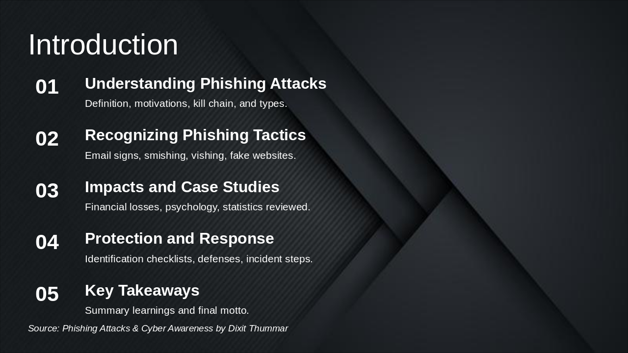 This agenda slide outlines a presentation on phishing, starting with understanding attacks (definitions, motivations, kill chain, types). It continues with recognizing tactics (email signs, smishing, vishing, fake sites), impacts and case studies, protection/response strategies, and key takeaways.