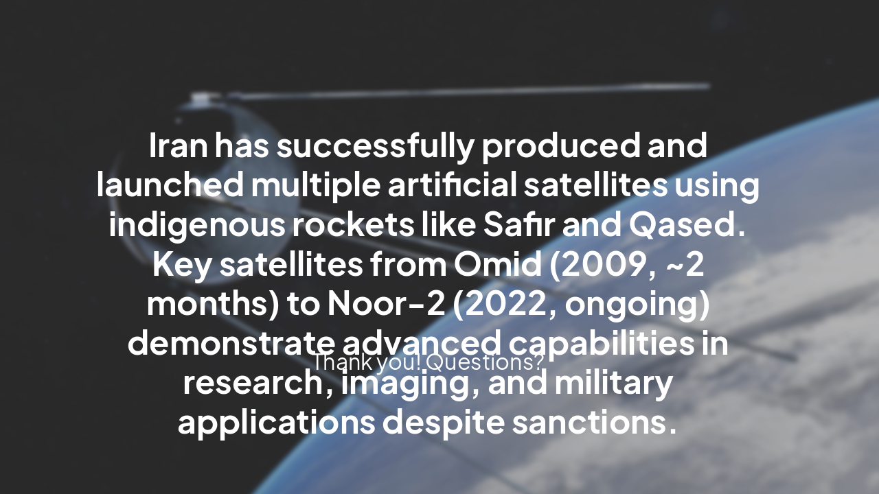 This presentation introduces artificial satellites, their uses, types, and orbits, then provides a detailed overview of Iran's indigenous space program. It highlights key milestones from Sina-1 (2005) to Noor-2 (2022), launch details using Safir andQ