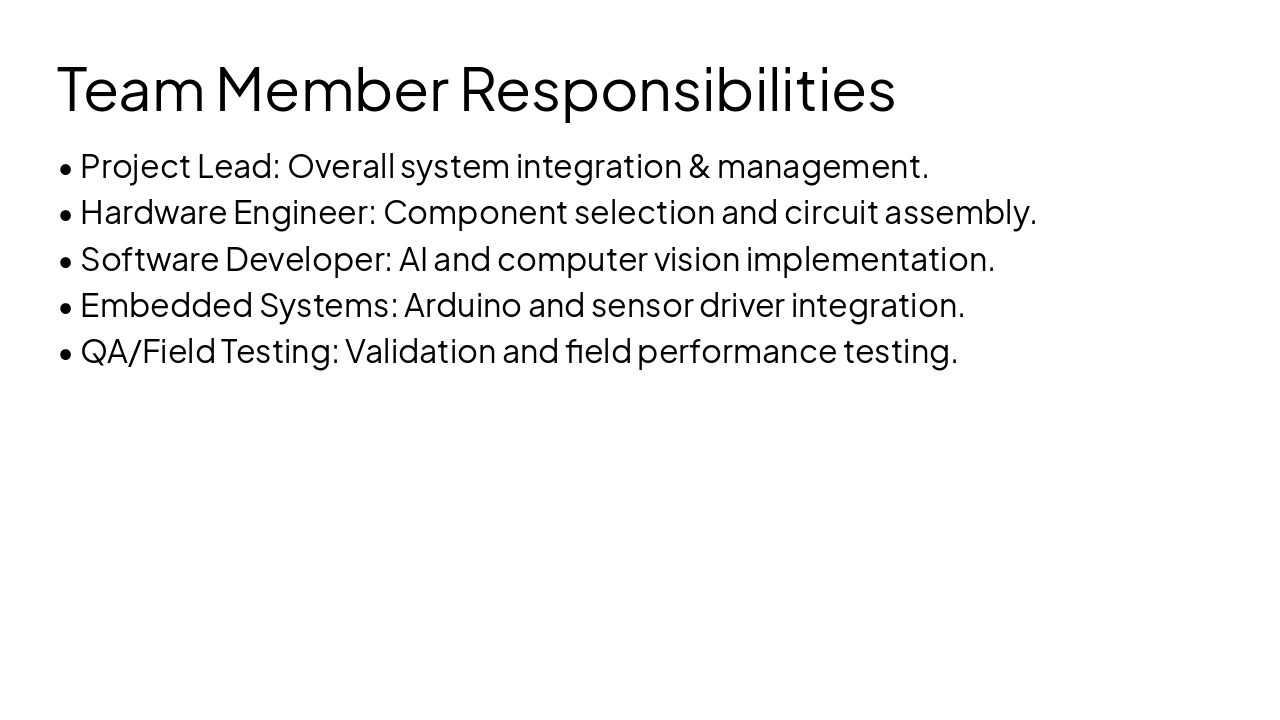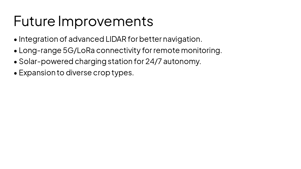 Create a modern, visually appealing university-level presentation titled "Autonomous Smart Farming Robot". Include slides: 1) Title slide, 2) Introduction & problem (agriculture challenges in Sri Lanka), 3) Objectives, 4) System overview diagram, 5) Hardware components, 6) Software architecture, 7) Working process (step-by-step), 8) AI & computer vision module, 9) Smart irrigation & spraying system (relay control), 10) Team member responsibilities (5 roles), 11) Cost estimation (LKR), 12) Advantages & impact, 13) Future improvements, 14) Conclusion. Use icons, clean layout, minimal text, and engineering-style diagrams.