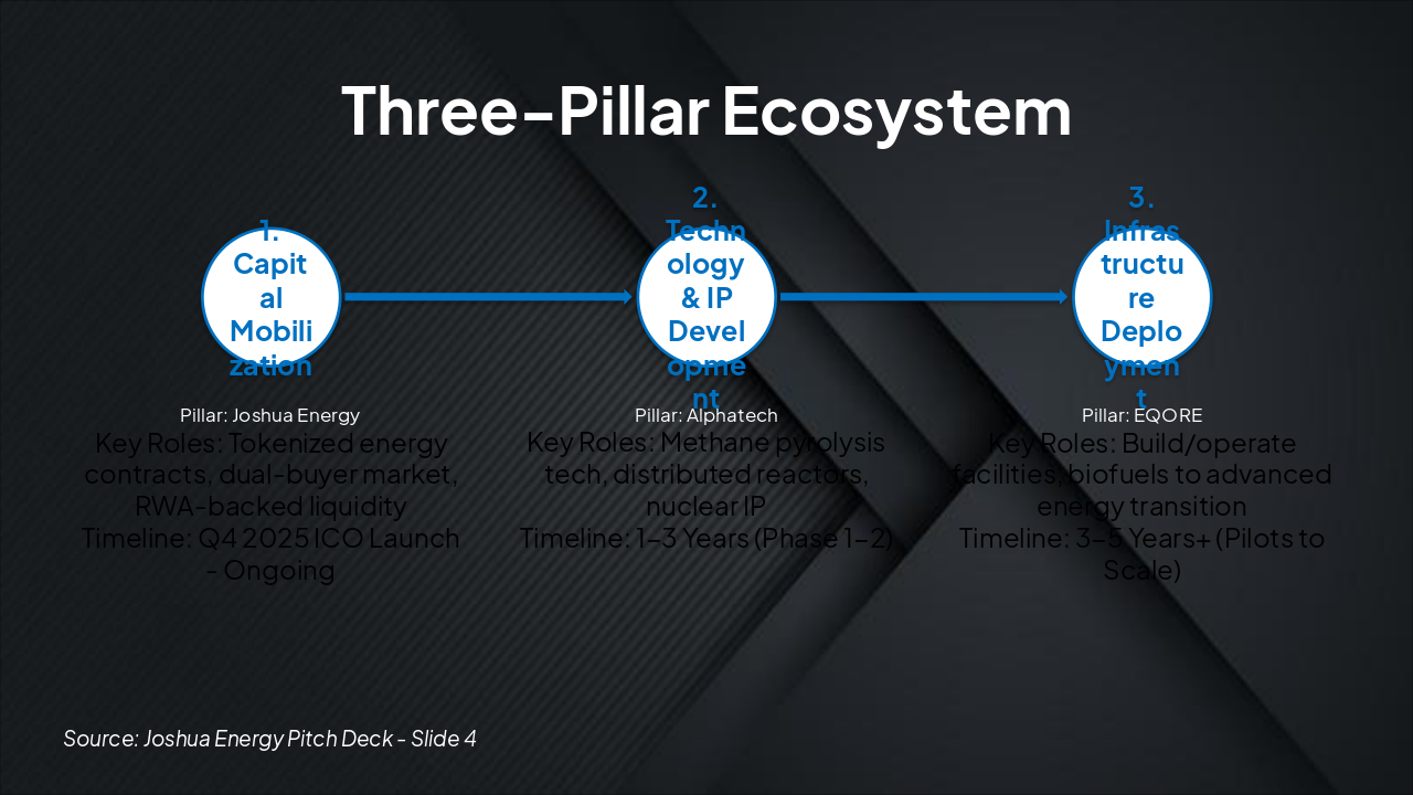The Three-Pillar Ecosystem workflow outlines three sequential steps: Capital Mobilization by Joshua Energy via tokenized contracts starting Q4 2025 ICO, Technology & IP Development by Alphatech over 1-3 years, and Infrastructure Deployment by EQORE from 3-5 years onward. Each pillar lists key roles like RWA-backed liquidity, methane pyrolysis tech, and facility operations with biofuels to energy transition.