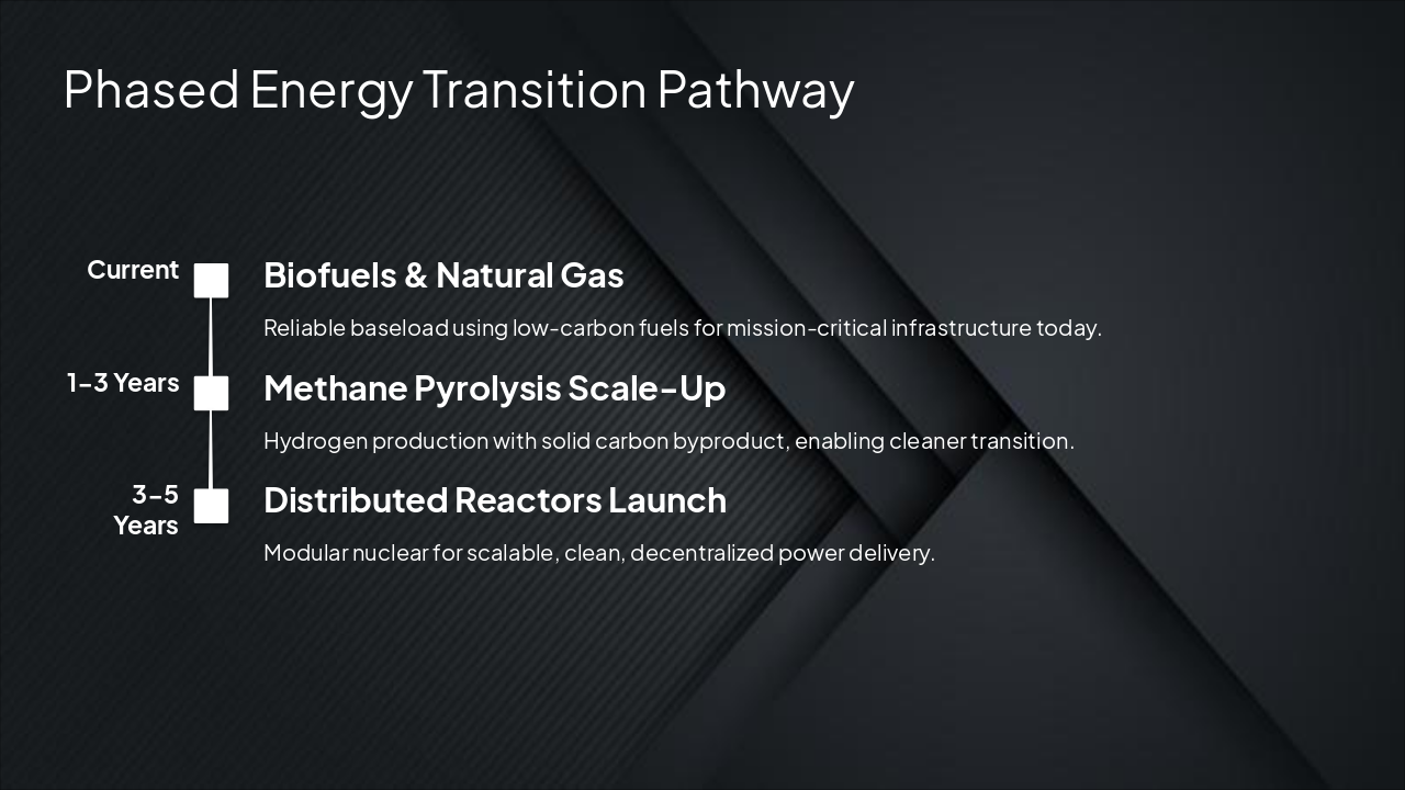 { "headers": [ "Step", "Pillar", "Key Roles", "Timeline" ], "rows": [ [ "1. Capital Mobilization", "Joshua Energy", "Tokenized energy contracts, dual-buyer market, RWA-backed liquidity", "Q4 2025 ICO Launch - Ongoing" ], [ "2. Technology & IP Development", "Alphatech", "Methane pyrolysis tech, distributed reactors, nuclear IP", "1-3 Years (Phase 1-2)" ], [ "3. Infrastructure Deployment", "EQORE", "Build/operate facilities, biofuels to advanced energy transition", "3-5 Years+ (Pilots to Scale)" ] ] }