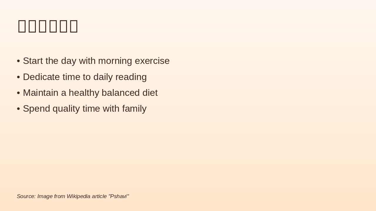 The slide titled "日常幸福习惯" (Daily Happiness Habits) features an image and outlines four key practices for enhancing everyday well-being. These include starting the day with morning exercise, dedicating time to daily reading, maintaining a healthy balanced diet, and spending quality time with family.