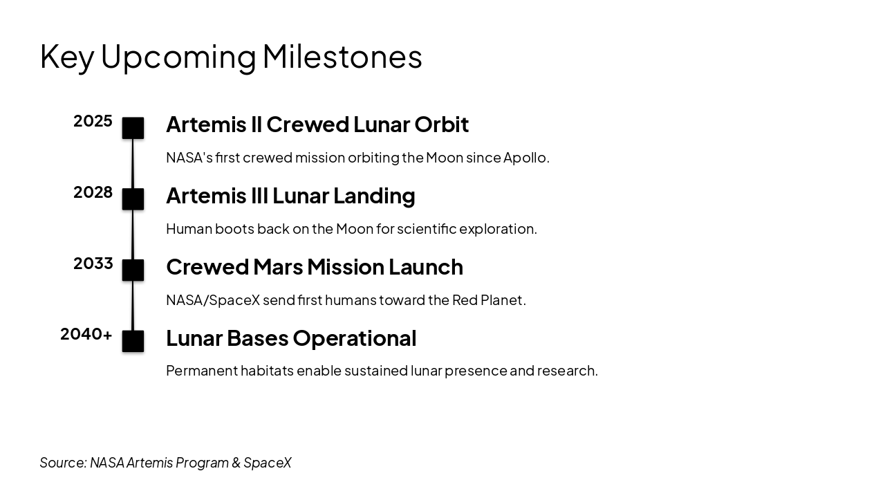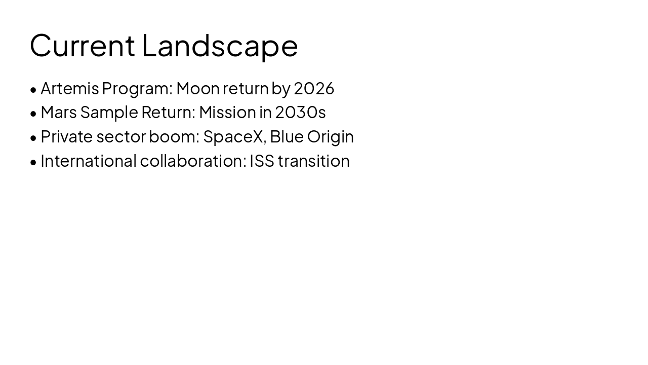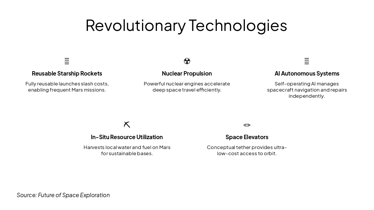 { "features": [ { "icon": "🚀", "heading": "Reusable Starship Rockets", "description": "Fully reusable launches slash costs, enabling frequent Mars missions." }, { "icon": "☢️", "heading": "Nuclear Propulsion", "description": "Powerful nuclear engines accelerate deep space travel efficiently." }, { "icon": "🤖", "heading": "AI Autonomous Systems", "description": "Self-operating AI manages spacecraft navigation and repairs independently." }, { "icon": "⛏️", "heading": "In-Situ Resource Utilization", "description": "Harvests local water and fuel on Mars for sustainable bases." }, { "icon": "🪢", "heading": "Space Elevators", "description": "Conceptual tether provides ultra-low-cost access to orbit." } ] }