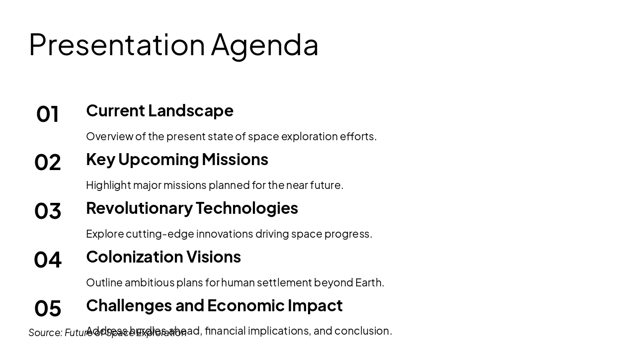 The "Revolutionary Technologies" slide features a grid of five cutting-edge space innovations. They include reusable Starship rockets for cost-effective Mars missions, nuclear propulsion for deep space, AI autonomous systems, in-situ resource utilization on Mars, and conceptual space elevators for cheap orbital access.