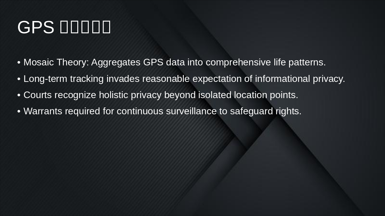 | 舊制度強調實體空間搜索,監聽與GPS追蹤較寬鬆,無嚴格數位令狀要求。隱私期待低,依賴一目瞭然法則,易忽略程序正義,導致證據易被排除。(28字) | 新制度轉向數位空間正當性,強制法官核發令狀,強化Mosaic理論與隱私保護。數位證據需雜湊驗證,限制另案擴大使用,注重自願性審查與證據鏈保全。(32字) |