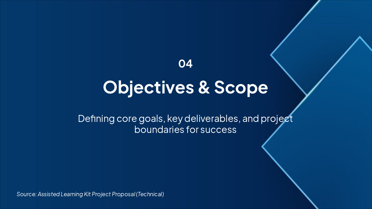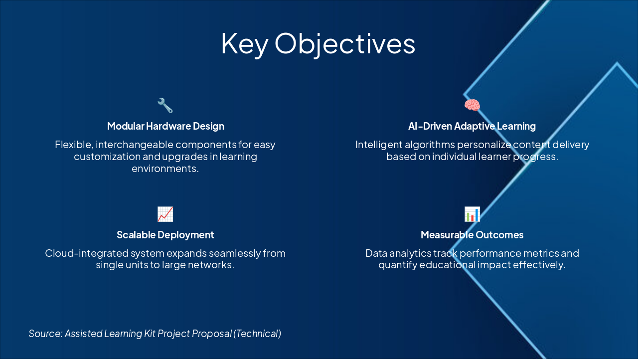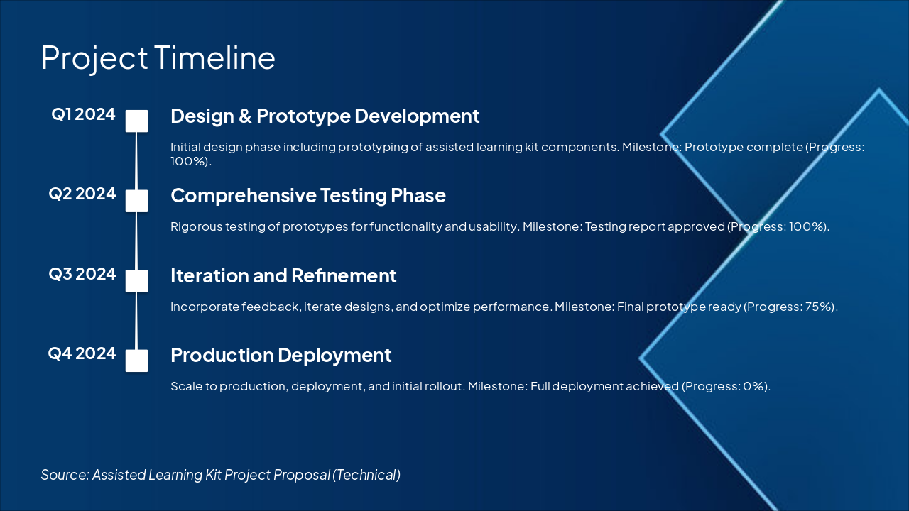 Q1 2024: Design & Prototype Development Initial design phase including prototyping of assisted learning kit components. Milestone: Prototype complete (Progress: 100%). Q2 2024: Comprehensive Testing Phase Rigorous testing of prototypes for functionality and usability. Milestone: Testing report approved (Progress: 100%). Q3 2024: Iteration and Refinement Incorporate feedback, iterate designs, and optimize performance. Milestone: Final prototype ready (Progress: 75%). Q4 2024: Production Deployment Scale to production, deployment, and initial rollout. Milestone: Full deployment achieved (Progress: 0%).