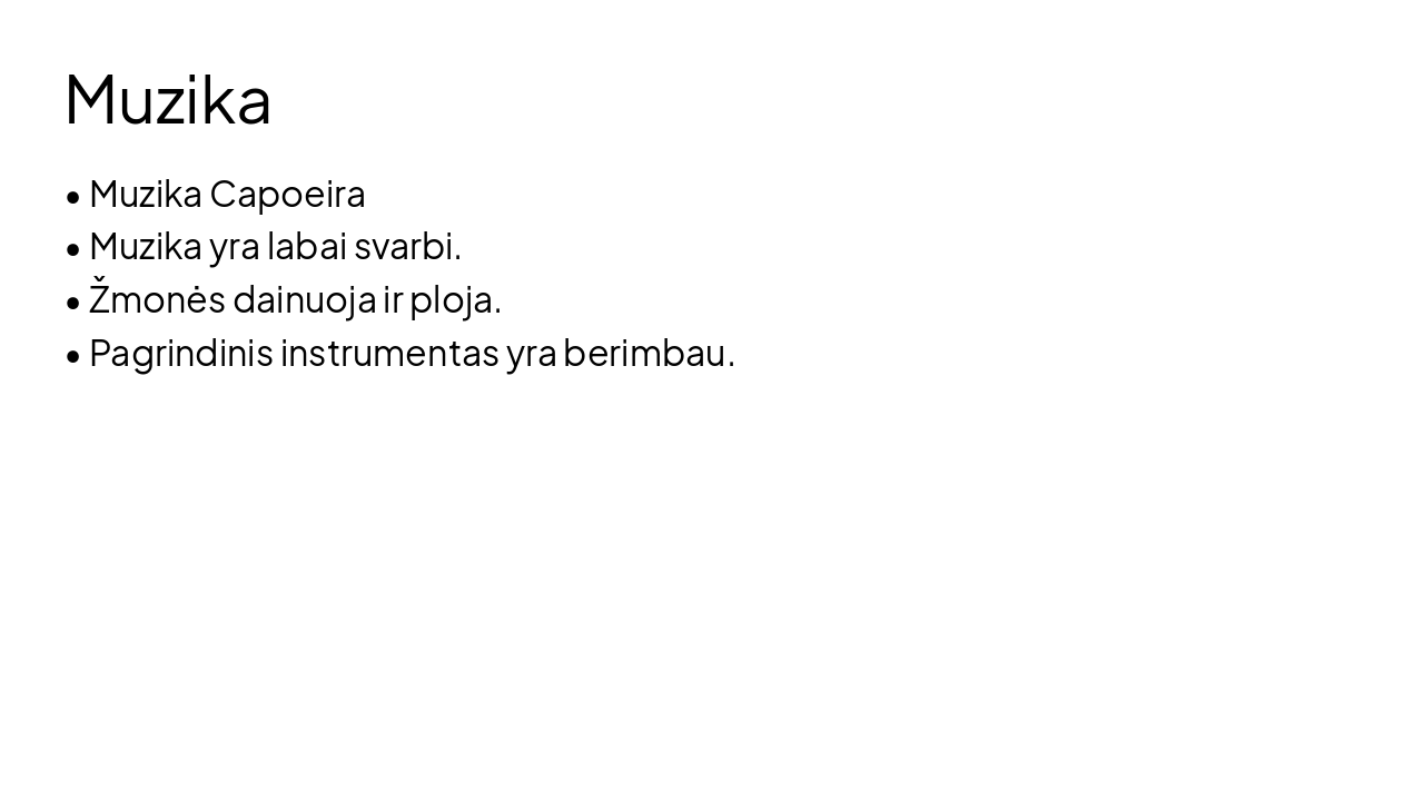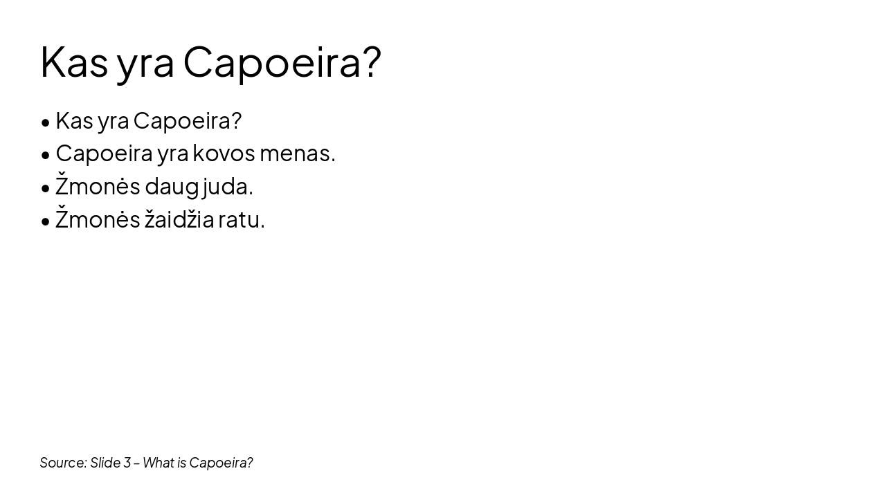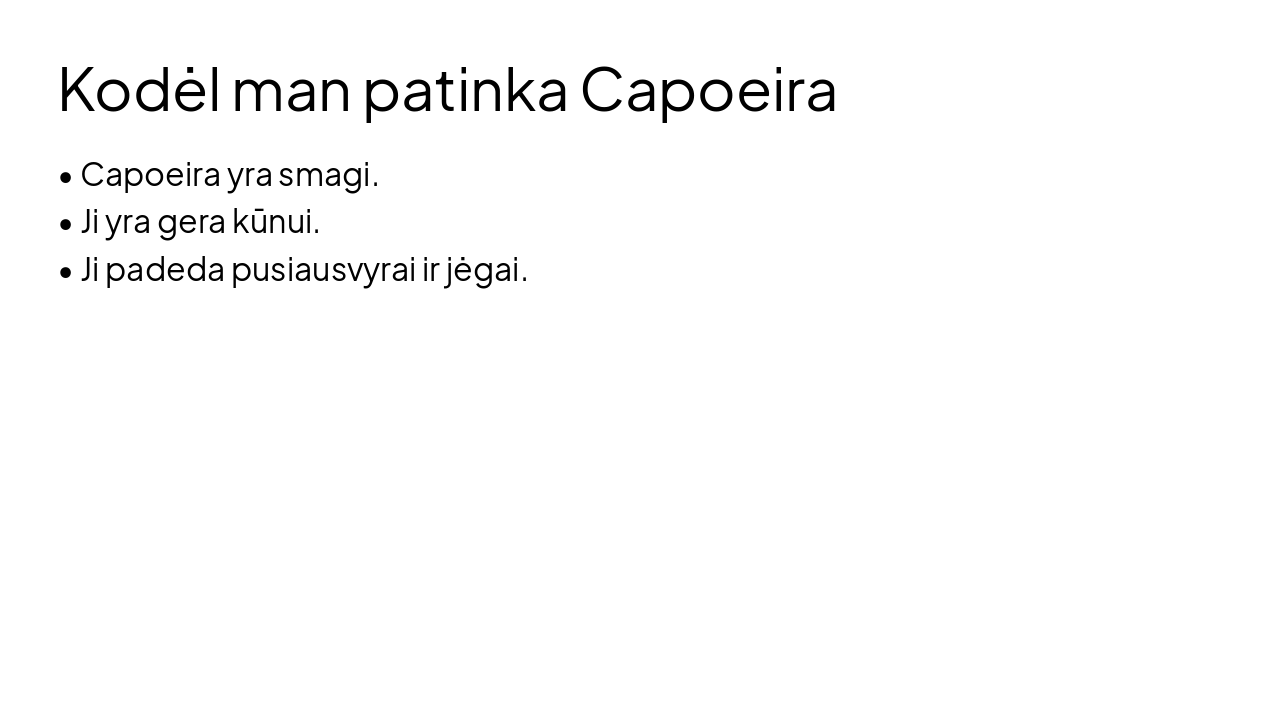 Slide 1 – Title Capoeira • Capoeira is a Brazilian sport. • It is a mix of dance, sport, and music. ⸻ Slide 2 – Origin Where is Capoeira from? • Capoeira is from Brazil. • It started many years ago. • It comes from African culture. ⸻ Slide 3 – What is Capoeira? What is Capoeira? • Capoeira is a martial art. • People move a lot. • People play in a circle. ⸻ Slide 4 – Music Music in Capoeira • Music is very important. • People sing and clap. • The main instrument is the berimbau. ⸻ Slide 5 – Movements Movements • Movements are fast and slow. • People kick and jump. • People do not hit hard. ⸻ Slide 6 – Capoeira Circle The Roda • People stand in a circle. • Two people play in the middle. • Others sing and clap. ⸻ Slide 7 – Why I Like Capoeira Why I Like Capoeira • Capoeira is fun. • It is good for the body. • It helps balance and strength. ⸻ Slide 8 – Conclusion Conclusion • Capoeira is a special sport. • It has music and movement. • I enjoy doing Capoeira.
