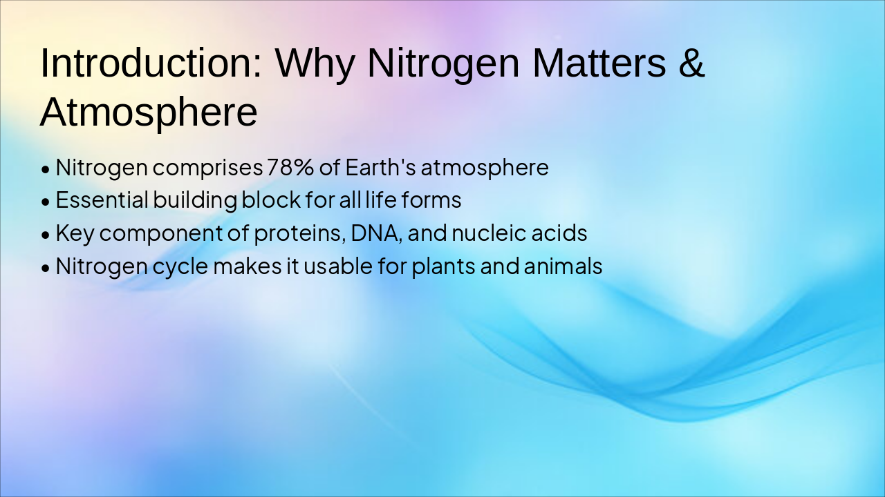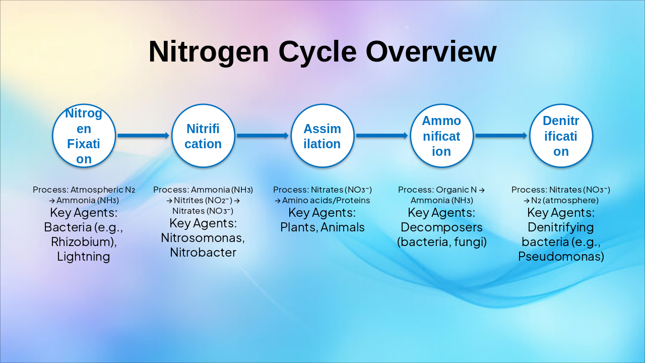 { "headers": [ "Stage", "Process", "Key Agents" ], "rows": [ [ "Nitrogen Fixation", "Atmospheric N₂ → Ammonia (NH₃)", "Bacteria (e.g., Rhizobium), Lightning" ], [ "Nitrification", "Ammonia (NH₃) → Nitrites (NO₂⁻) → Nitrates (NO₃⁻)", "Nitrosomonas, Nitrobacter" ], [ "Assimilation", "Nitrates (NO₃⁻) → Amino acids/Proteins", "Plants, Animals" ], [ "Ammonification", "Organic N → Ammonia (NH₃)", "Decomposers (bacteria, fungi)" ], [ "Denitrification", "Nitrates (NO₃⁻) → N₂ (atmosphere)", "Denitrifying bacteria (e.g., Pseudomonas)" ] ] }