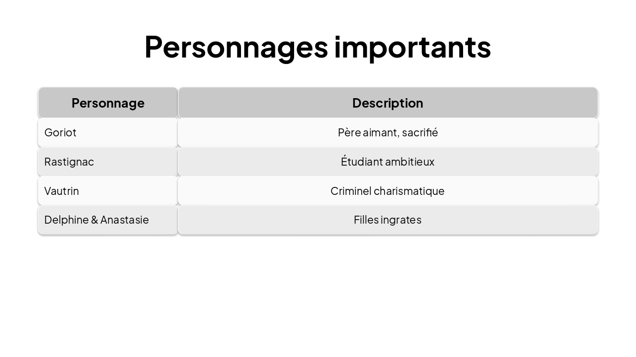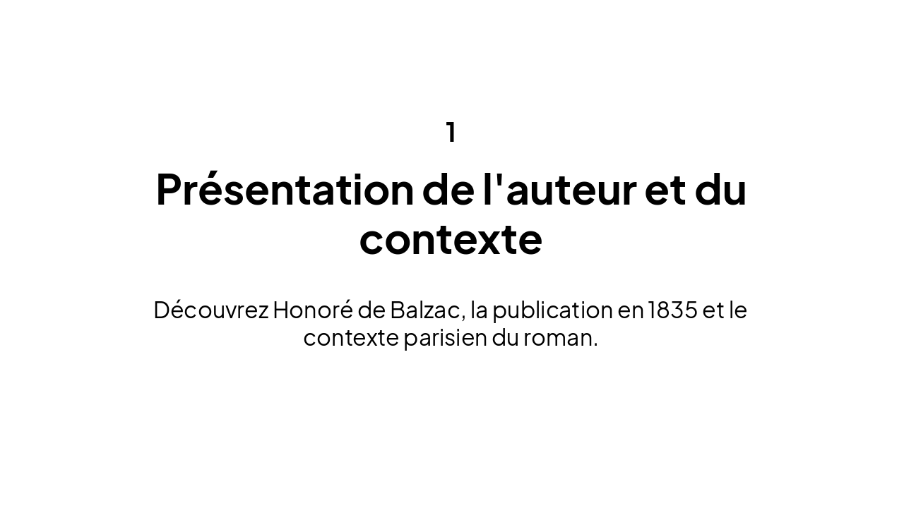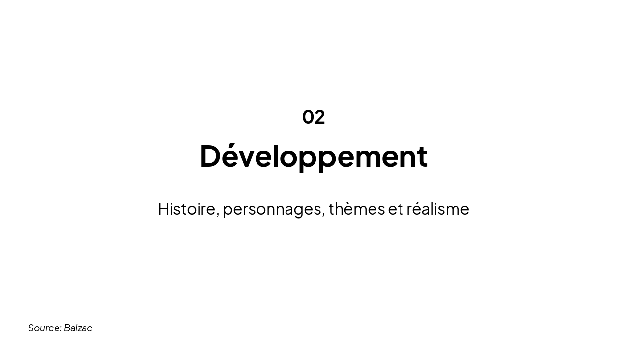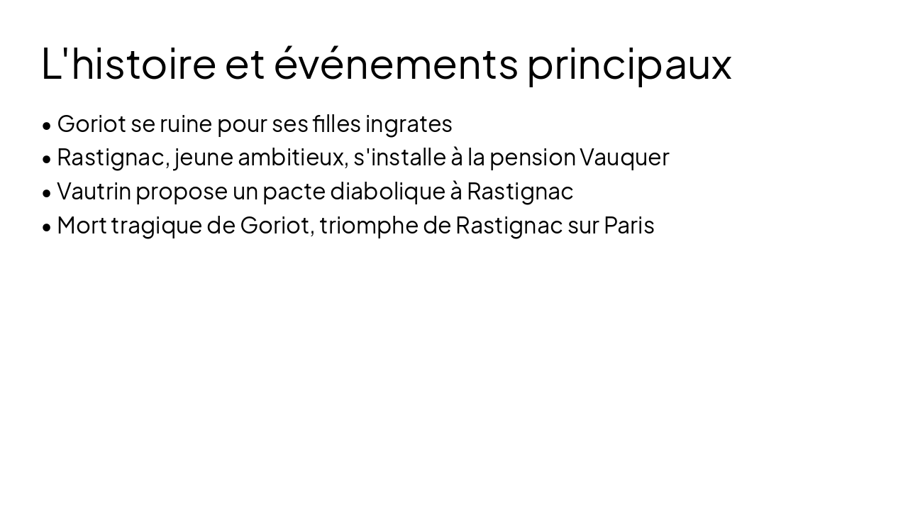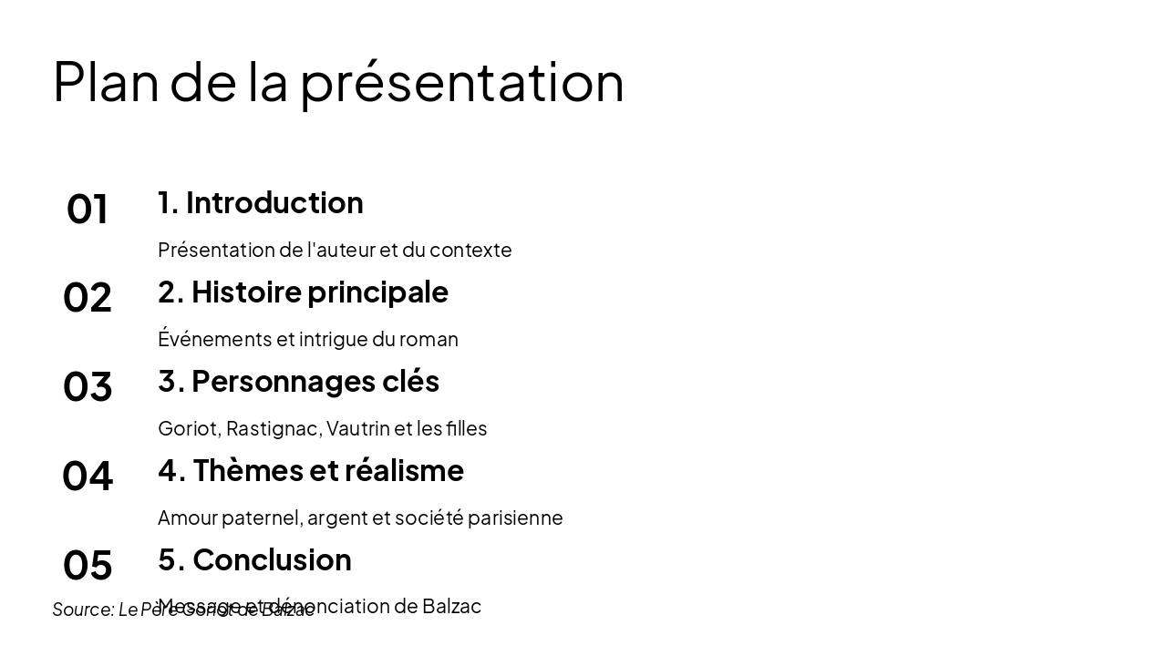 This agenda slide, titled "Plan de la présentation," outlines a five-part structure for a presentation on Balzac's novel. It covers introduction (author and context), main story (events and plot), key characters (Goriot, Rastignac, Vautrin, and daughters), themes and realism (paternal love, money, Parisian society), and conclusion (Balzac's message and denunciation).