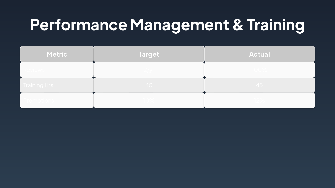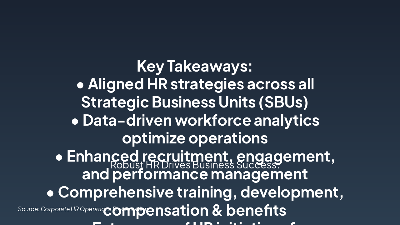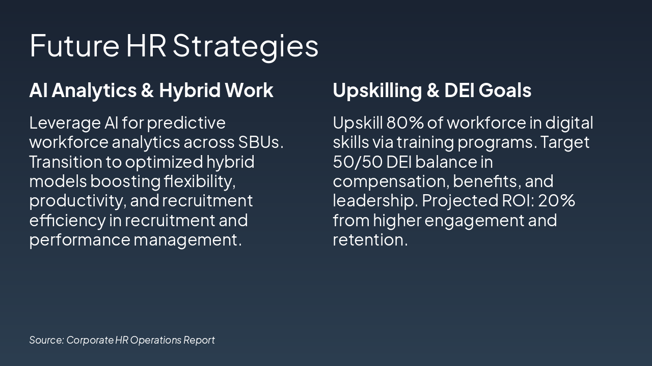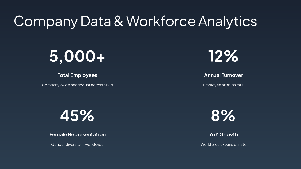 Recruitment workflow across all Strategic Business Units (SBUs). Stages: Sourcing ā Screening ā Interviews ā Offer ā Onboarding. Average time-to-hire: 35 days. 90% retention rate in first year. Integrates with HR structure, workforce analytics, employee engagement, performance management, training & development, compensation & benefits, and future HR strategies for a data-driven approach.