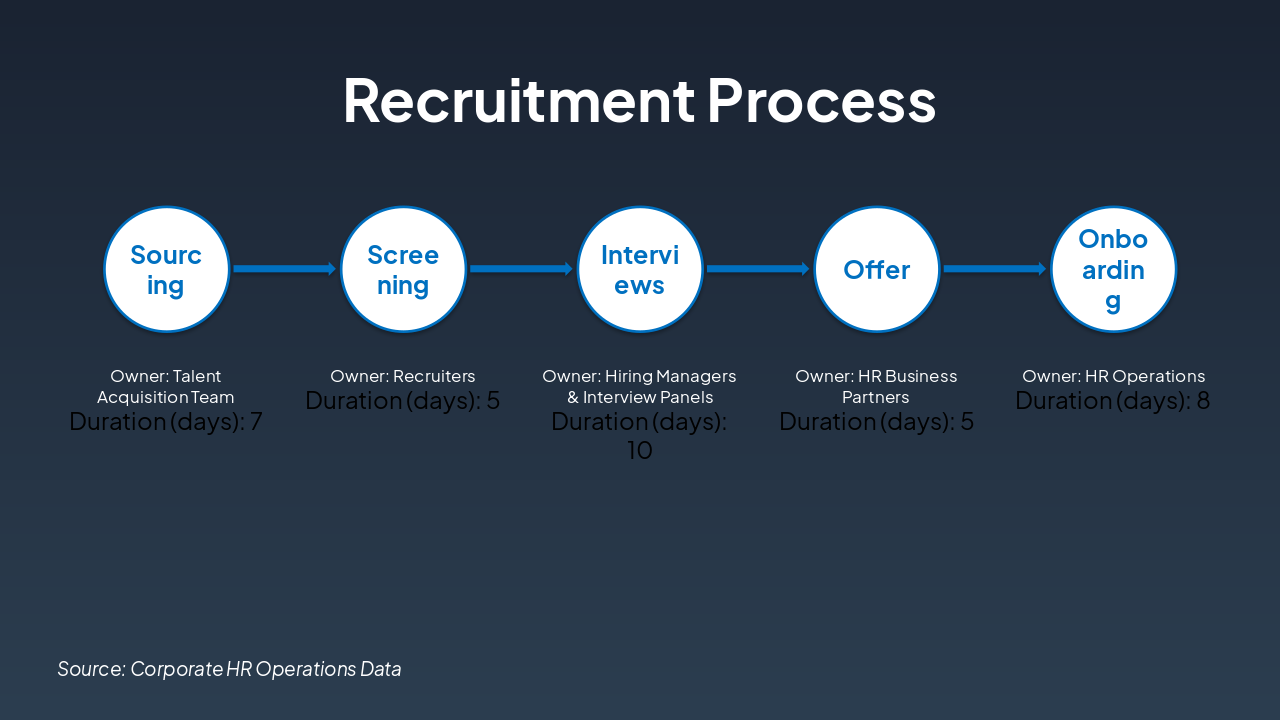 The Recruitment Process workflow slide outlines five phases: Sourcing (7 days by Talent Acquisition Team), Screening (5 days by Recruiters), Interviews (10 days by Hiring Managers & Panels), Offer (5 days by HR Business Partners), and Onboarding (8 days by HR Operations). Total duration spans 35 days across these owner-assigned steps.