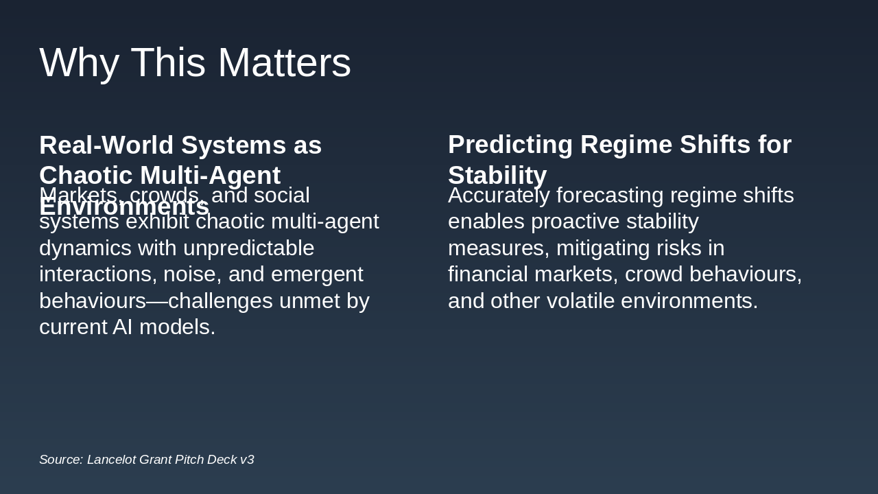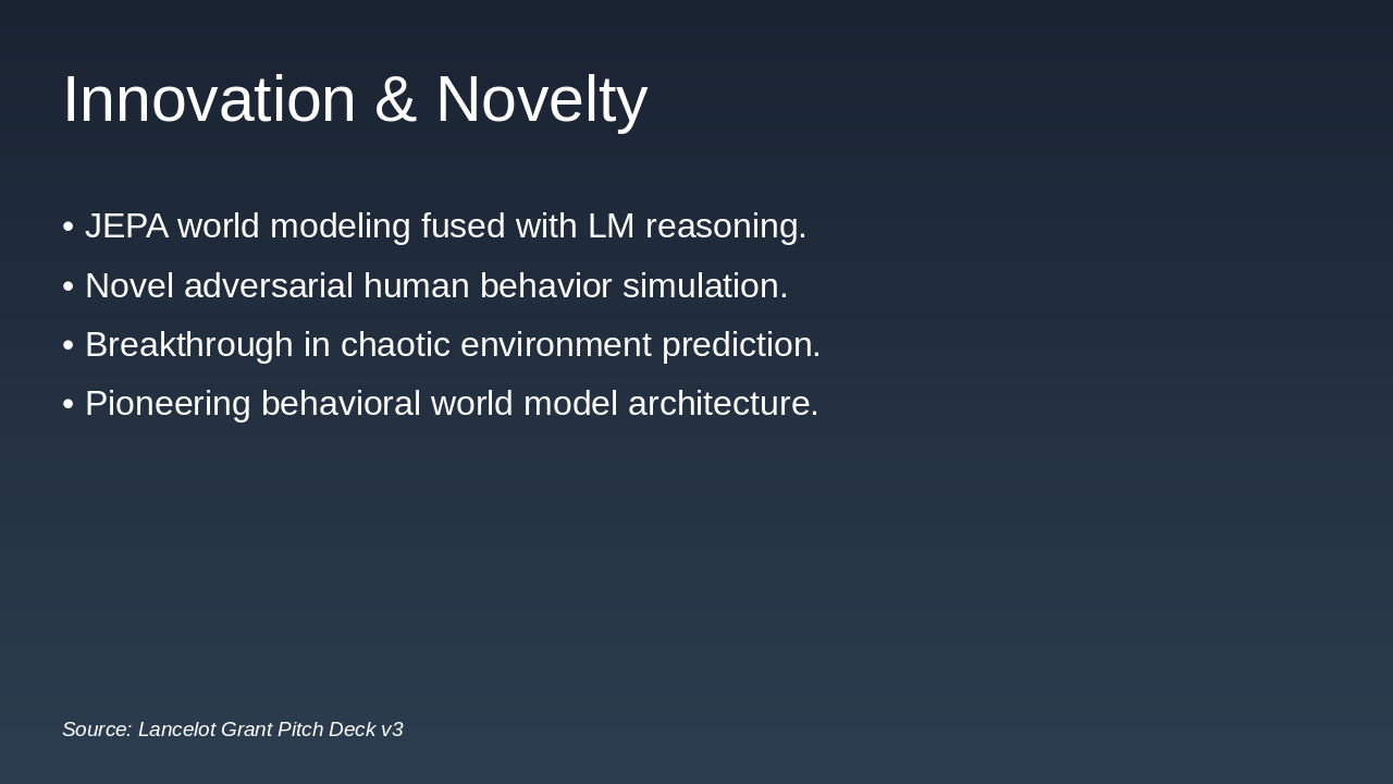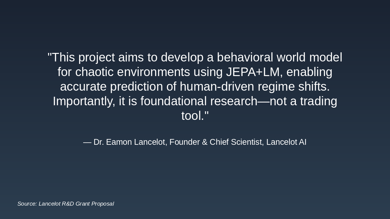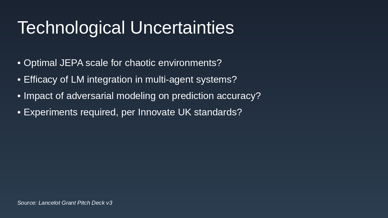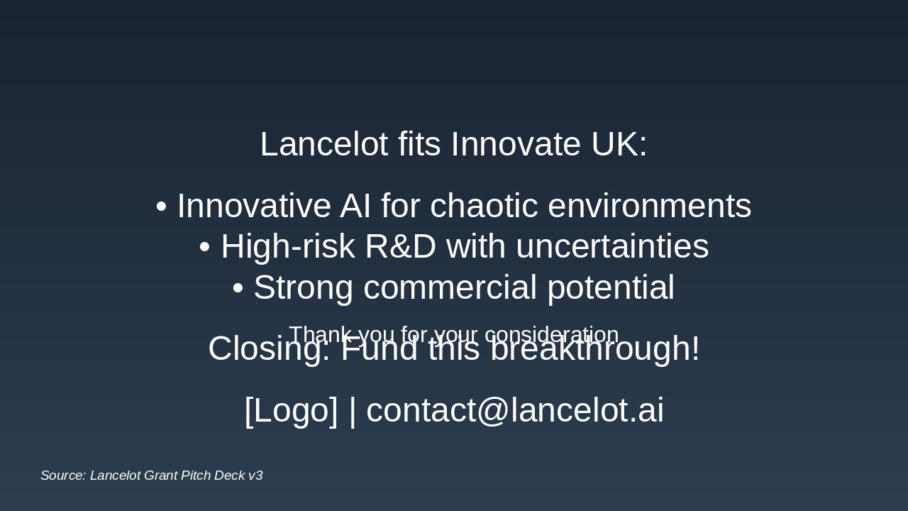 Lancelot perfectly aligns with Innovate UK criteria: groundbreaking AI innovation for chaotic environments, high-risk R&D, and clear commercial pathway. End with strong CTA: 'Fund this breakthrough!' Include logo and contact details. Thank assessors.
