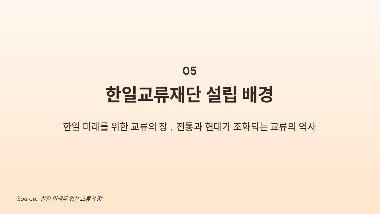 이 슬라이드는 한일교류재단의 설립 배경을 다루는 섹션 헤더(05번)이다. 부제는 "한일 미래를 위한 교류의 장, 전통과 현대가 조화되는 교류의 역사"로, 양국 간 교류의 역사적 맥락을 강조한다.