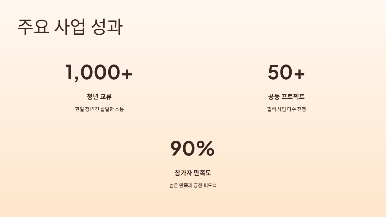 주요 사업 성과로 한일 청년 간 1,000+ 청년 교류와 50+ 공동 프로젝트를 통해 활발한 소통과 협력이 이루어졌다. 참가자 만족도는 90%에 달하며 높은 만족과 긍정 피드백을 받았다.