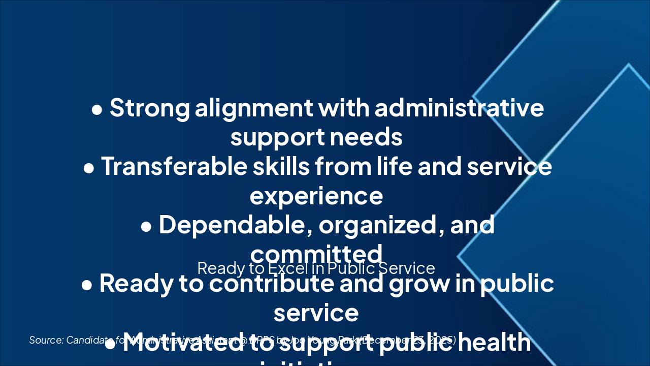 This slide highlights the candidate's strong alignment with administrative needs, transferable skills, dependability, organization, commitment, and motivation to contribute to public health initiatives. It closes with thanks and enthusiasm for discussing the fit for DPPS under the subtitle "Ready to Excel in Public Service."
