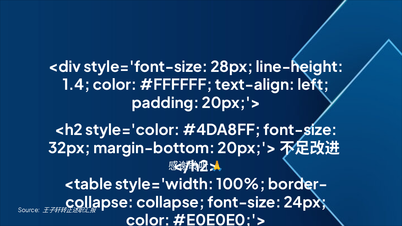 <h2 style='color: #4DA8FF; font-size: 32px; margin-bottom: 20px;'>不足改进</h2> <table style='width: 100%; border-collapse: collapse; font-size: 24px; color: #E0E0E0;'> <tr><td style='padding: 12px; border: 1px solid #4DA8FF;'>性能优化空间</td><td style='padding: 12px; border: 1px solid #4DA8FF;'>架构设计深度</td></tr> </table>