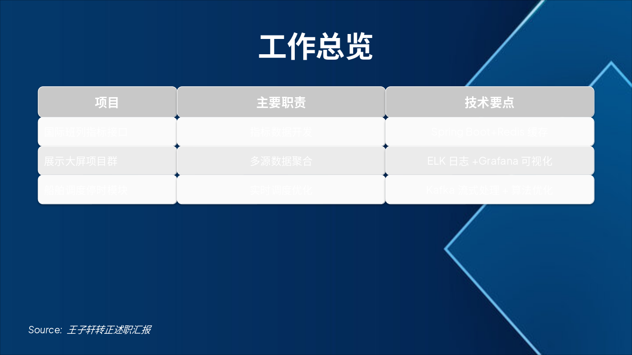 该幻灯片展示了工作总览表格,包括国际班列指标接口、展示大屏项目群和船舶调度停时模块三个项目。每个项目列出了主要职责和技术要点,如Spring Boot+Redis缓存、ELK日志+Grafana可视化和Kafka流式处理+算法优化。