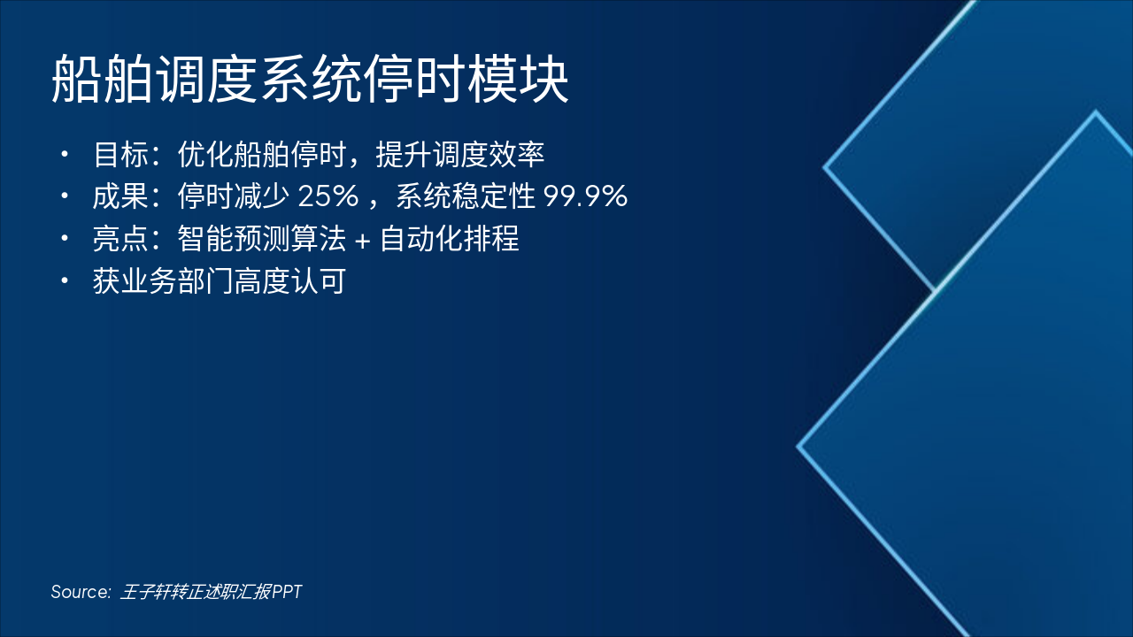 船舶调度系统停时模块的目标是优化船舶停时,提升调度效率。成果包括停时减少25%、系统稳定性达99.9%,亮点为智能预测算法与自动化排程,并获业务部门高度认可。