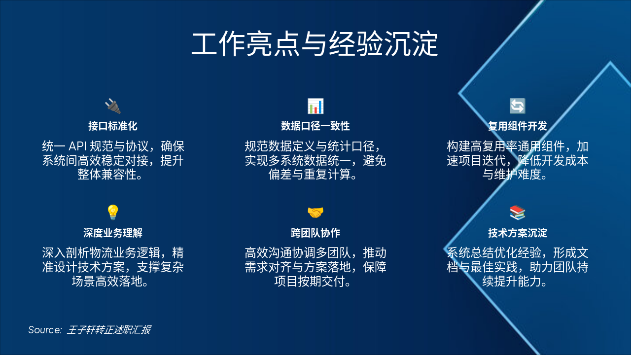 该幻灯片展示了工作亮点与经验沉淀,包括接口标准化、数据口径一致性、复用组件开发、深度业务理解、跨团队协作和技术方案沉淀等六大特征。每个特征通过图标、标题和描述突出其在提升系统兼容性、降低成本、保障交付等方面的价值。