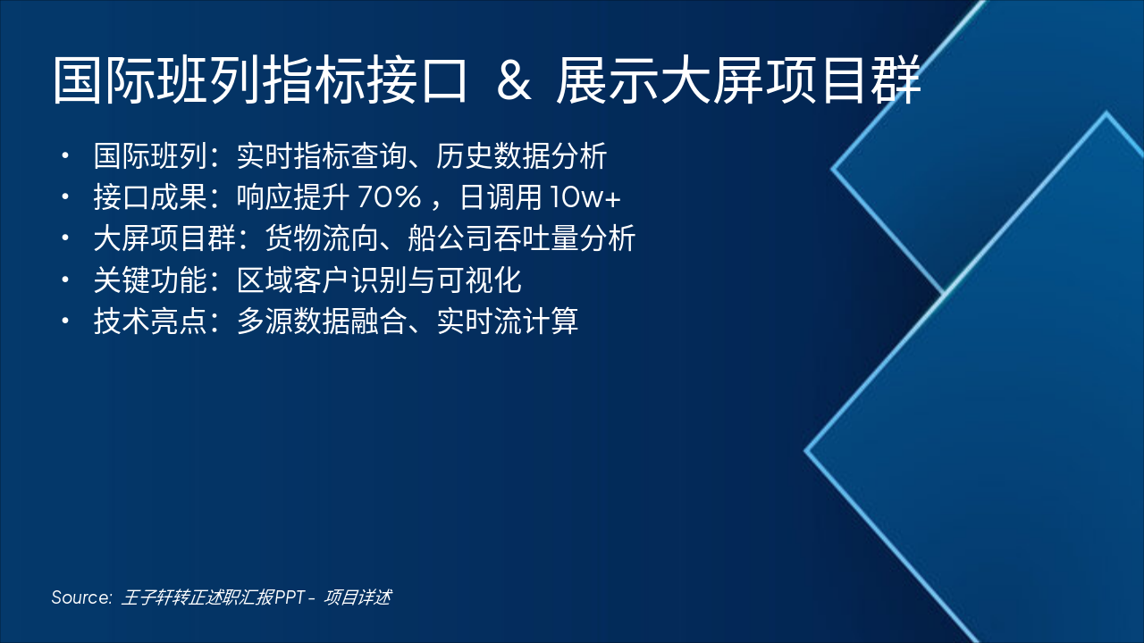 详细强化版《王子轩转正述职汇报PPT》,适用于研发中心后端开发岗位。内容需充分详实,包括: 1. 个人基本情况与岗位定位(教育背景、职责、技术栈、定位) 2. 工作总览(表格展示主要项目、职责与技术要点) 3. 项目详述:国际班列指标接口开发(功能、成果、技术难点) 4. 项目详述:展示大屏类项目群(大宗货物流向、船公司吞吐量牵引、关键营销区域与客户识别) 5. 项目详述:船舶调度系统停时模块(目标、成果、亮点) 6. 工作亮点与经验沉淀(接口标准化、数据口径一致性、复用性、业务理解、协作) 7. 不足与改进方向(表格形式) 8. 未来工作计划(具体量化目标) 9. 个人成长与心得体会(成长思考与职业感悟) 10. 结语与转正展望(正式感谢与愿景) 风格要求:简约科技蓝、层次分明、汇报型PPT风格,适合转正述职使用。