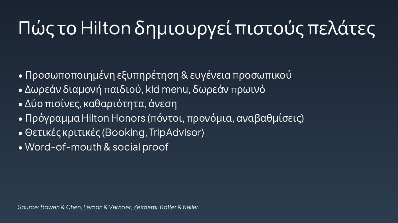 Closing message: Μακροχρόνια σχέση εμπιστοσύνης. Call-to-action: Επικοινωνήστε για να ενισχύσετε την πιστότητα των πελατών σας.