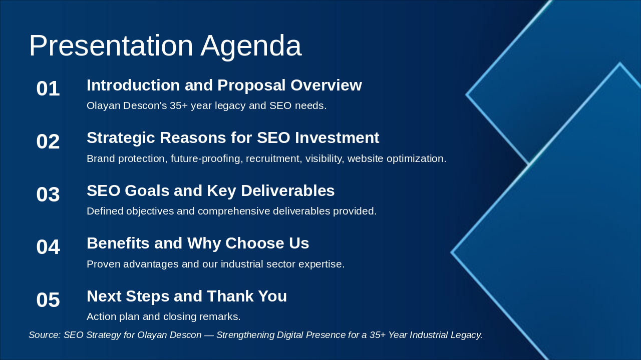 This agenda slide outlines a five-part presentation structure: Introduction and Proposal Overview (Olayan Descon's legacy and SEO needs), Strategic Reasons for SEO Investment (brand protection, visibility, etc.), SEO Goals and Key Deliverables, Benefits and Why Choose Us (industrial expertise), and Next Steps and Thank You. It emphasizes strategic value, objectives, and action plans for SEO services.