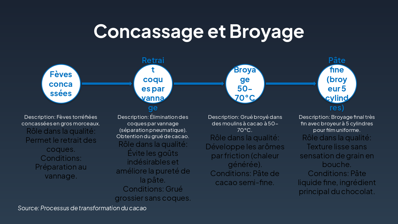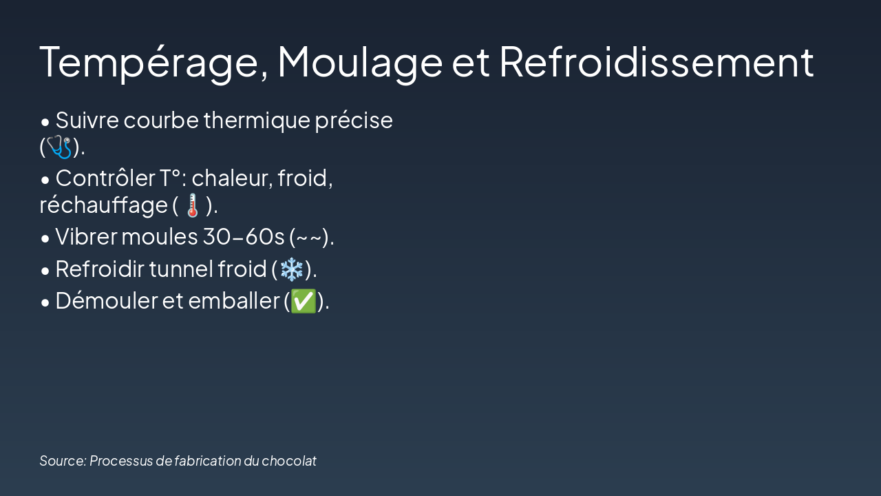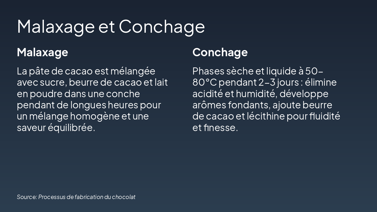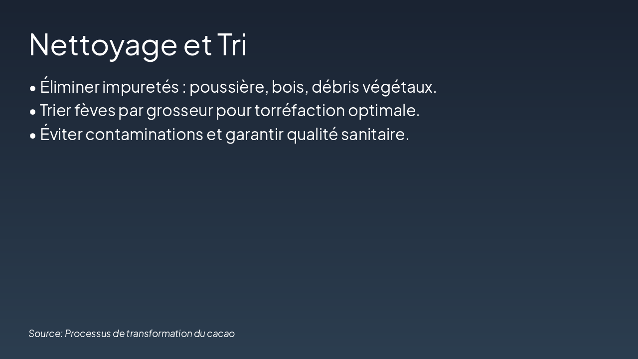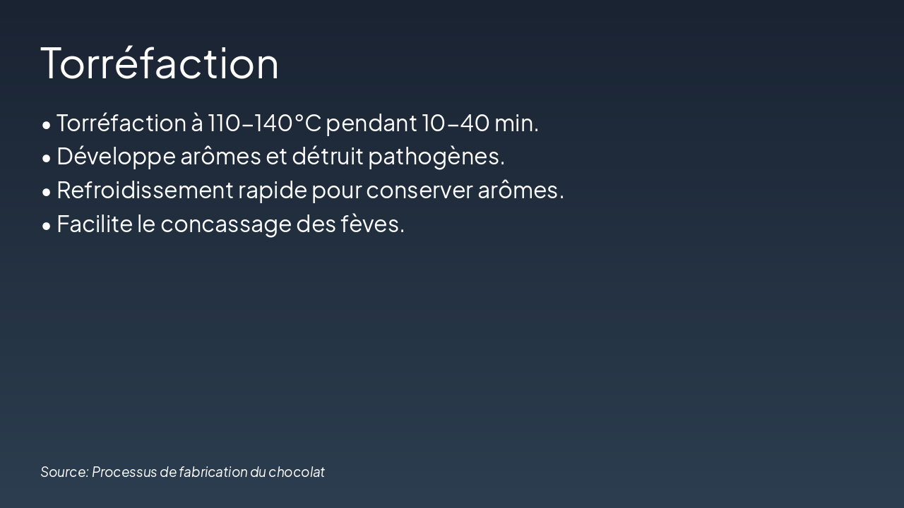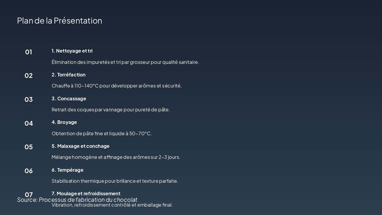 Ce plan de présentation détaille les étapes de transformation du cacao, du nettoyage et tri des fèves jusqu'au moulage et refroidissement final. Il inclut la torréfaction, le concassage, le broyage, le malaxage/conchage, le tempérage, suivis d'une conclusion.
