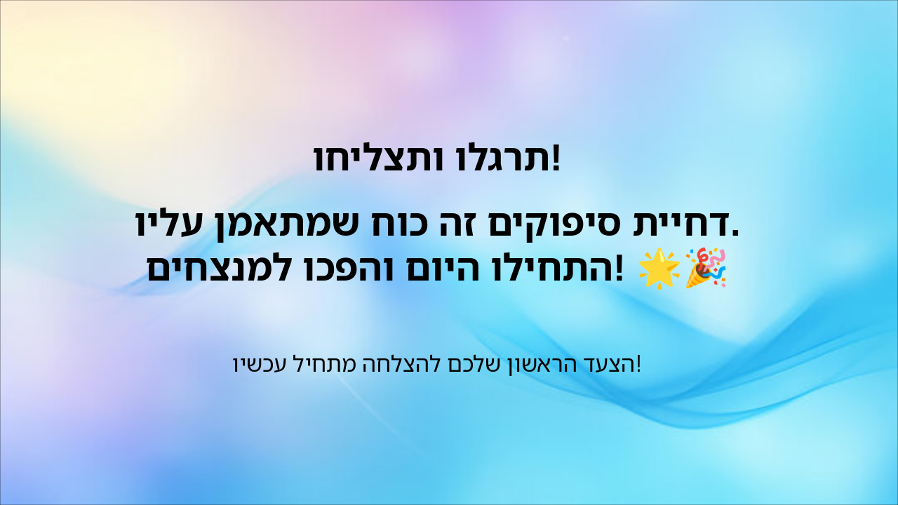 השקופית מסכמת בהערכה "תרגלו ותצליחו!", ומדגישה שדחיית סיפוקים היא כוח שניתן לאמן עליו. היא מעודדת להתחיל היום להפוך למנצחים, כאשר הצעד הראשון להצלחה מתחיל עכשיו! 🌟🎉